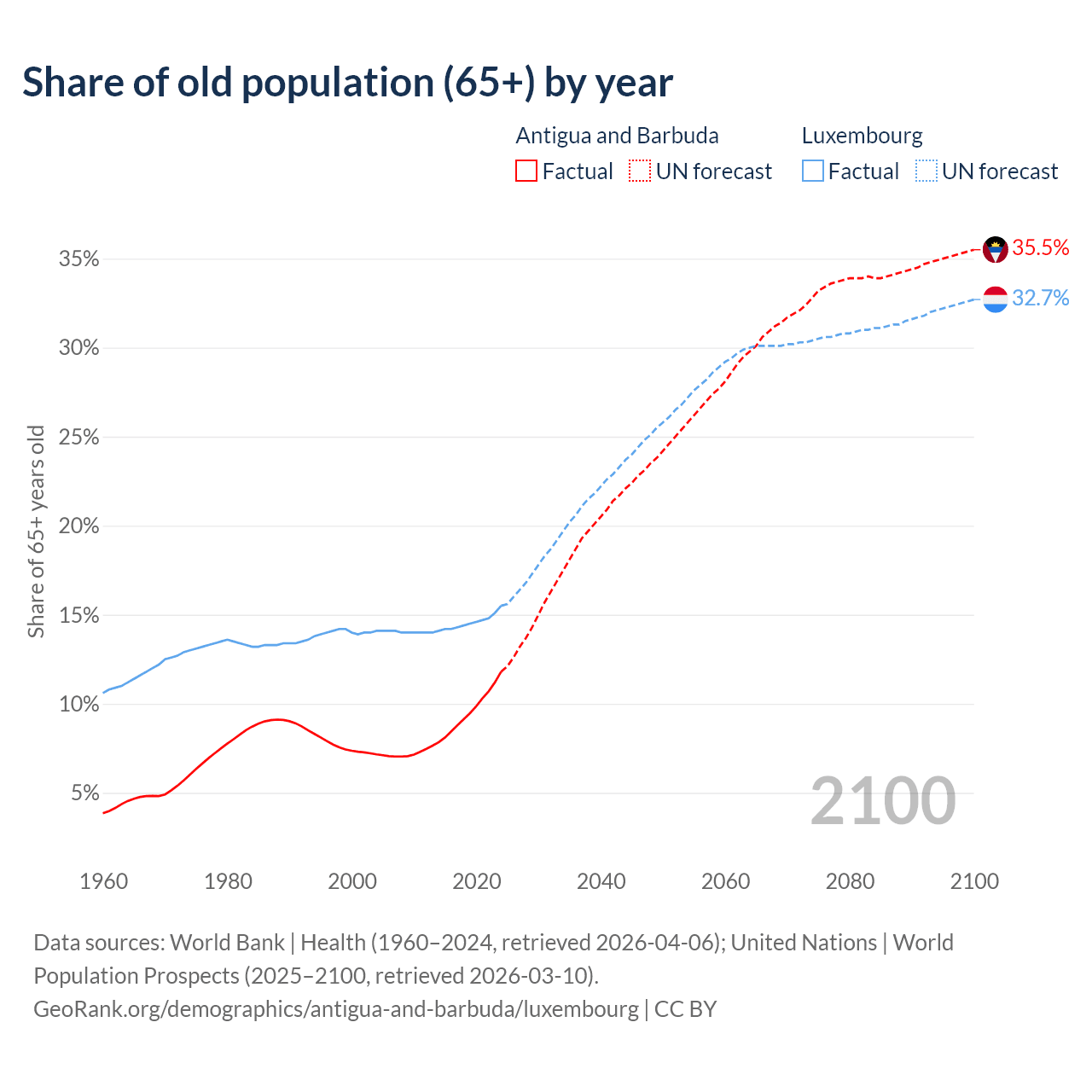 The share of older people aged 65 and over is 11.8% in Antigua and Barbuda and 15.5% in Luxembourg. Life expectancy in Antigua and Barbuda compared to Luxembourg .