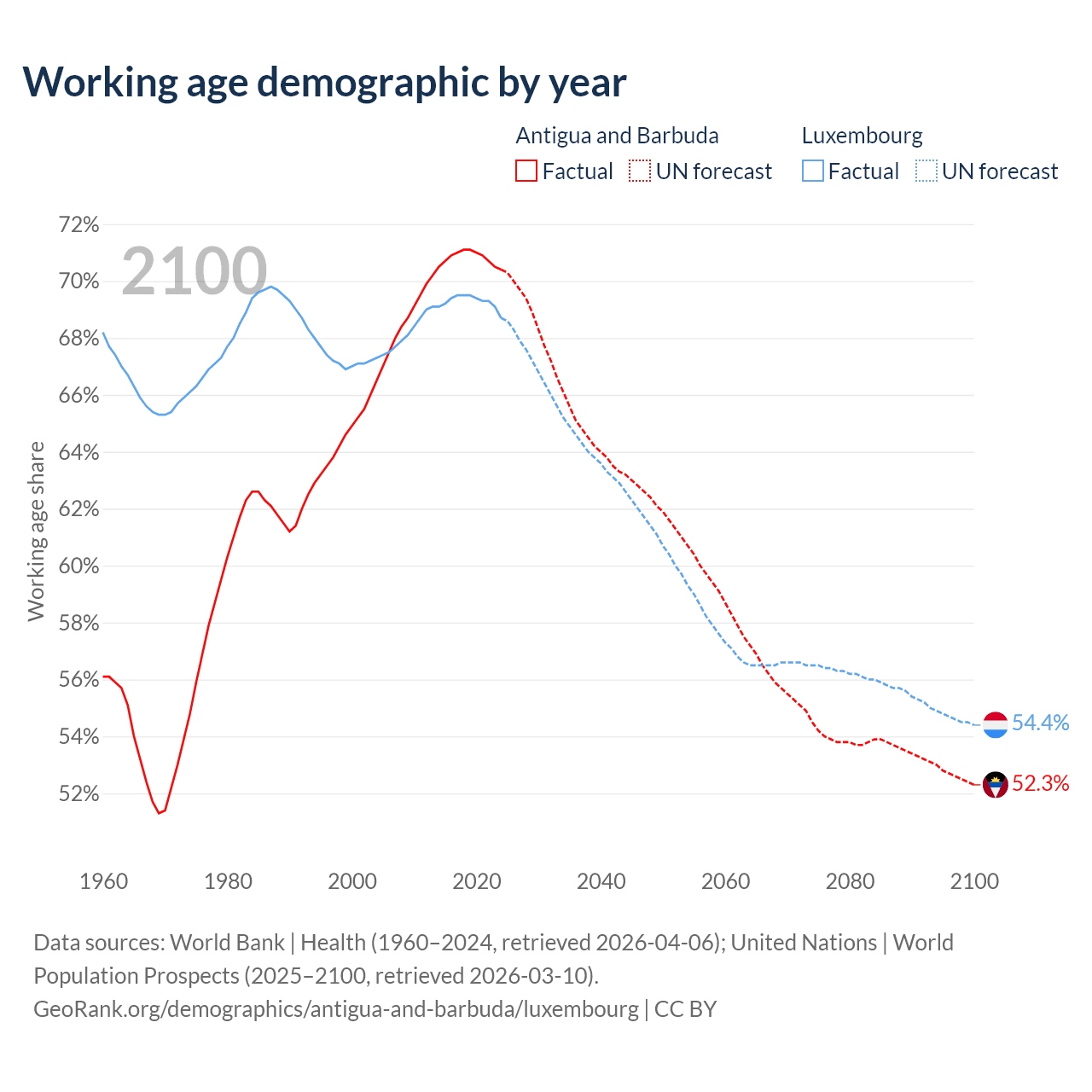 - Antigua and Barbuda has 66.7K working age adults (aged 15-64) vs 477K in Luxembourg.