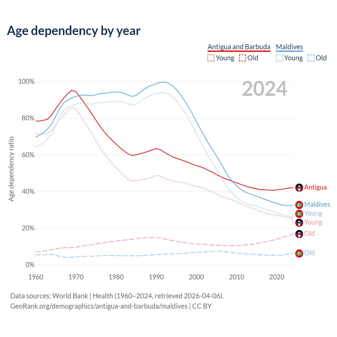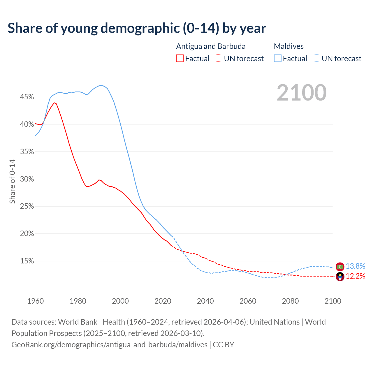 - The share of young demographic (0-15 years old) in Antigua and Barbuda is 17.8% vs 19.6% in Maldives.