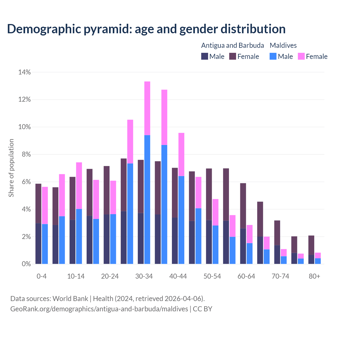- Antigua and Barbuda is ranked 67/196 by median age (oldest to youngest) vs 90/196 for Maldives.