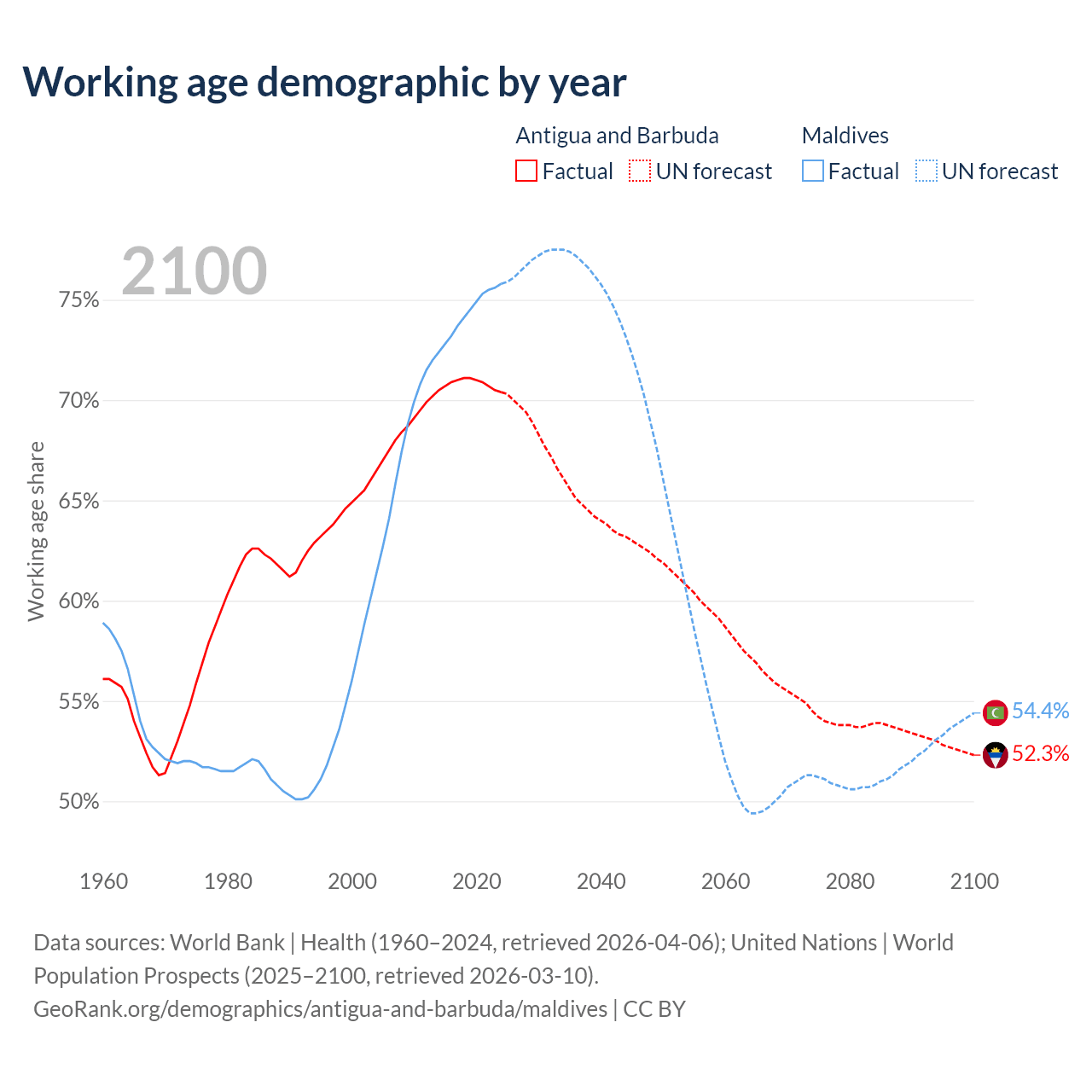 Median age Antigua and Barbuda vs Maldives, 1960-2100