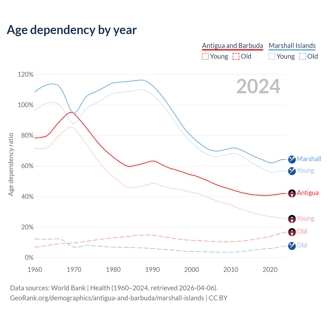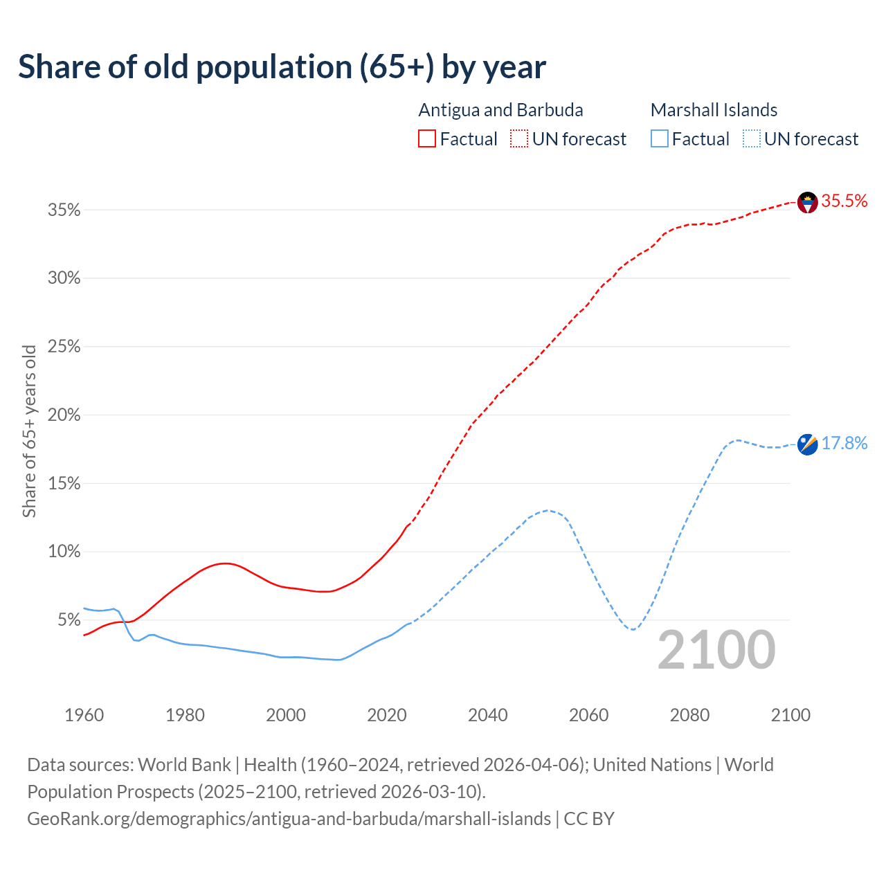 - The share of old-age demographic (65+) in Antigua and Barbuda is 11.8% vs 4.64% in the Marshall Islands.