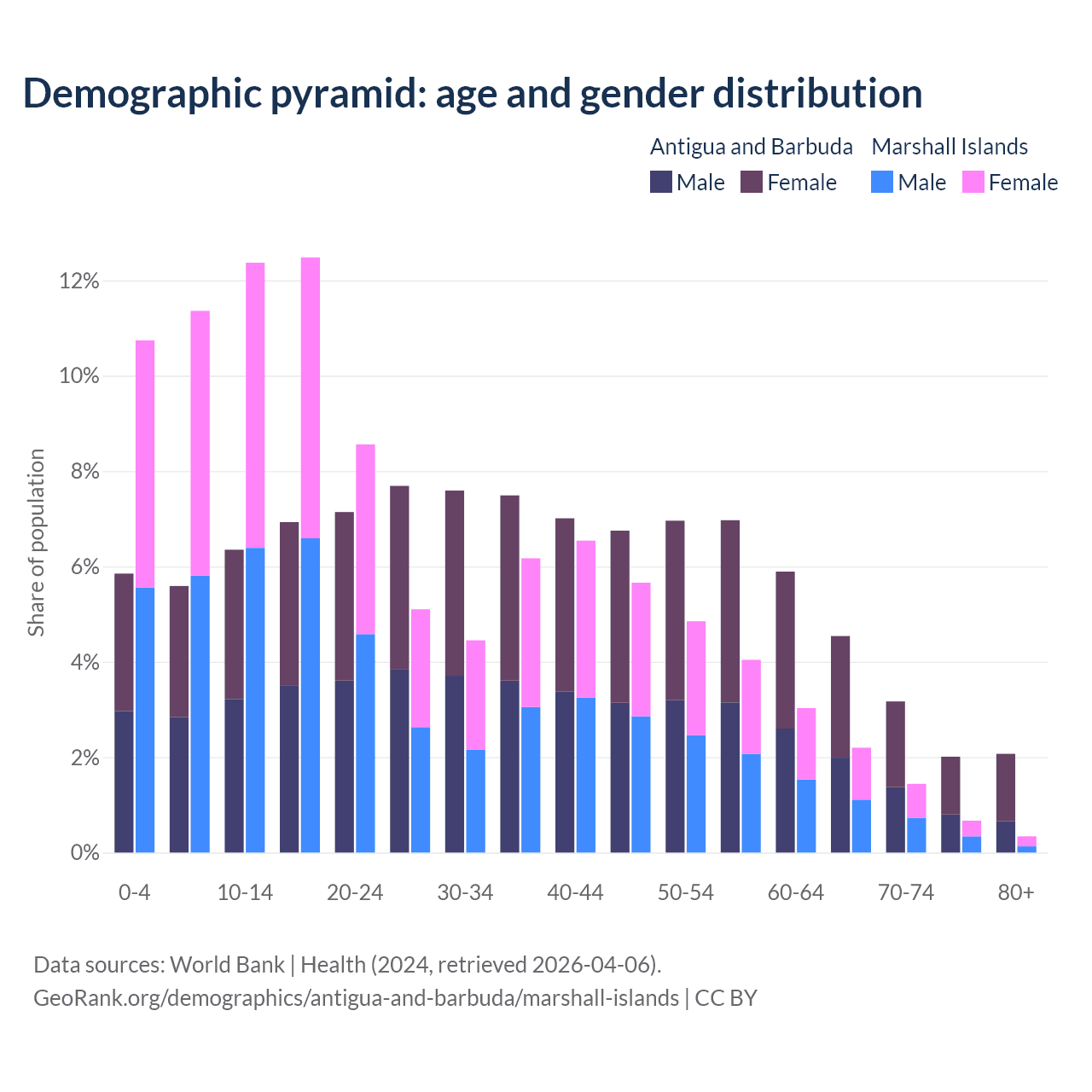 - As of 2026, the population of Antigua and Barbuda is 94.8K vs 35.1K in the Marshall Islands - 2.7 times difference.