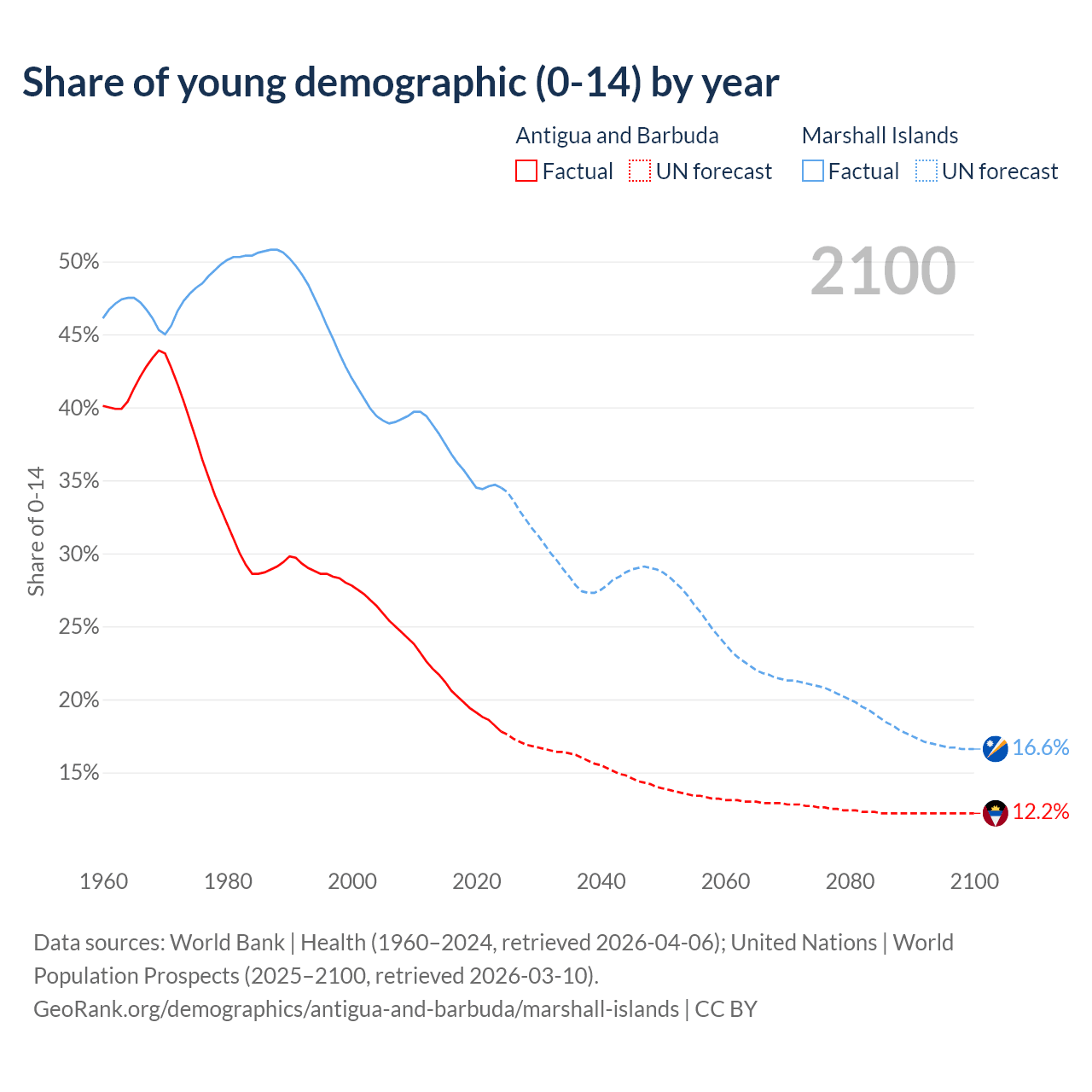 - The share of young demographic (0-15 years old) in Antigua and Barbuda is 17.8% vs 34.5% in the Marshall Islands.
