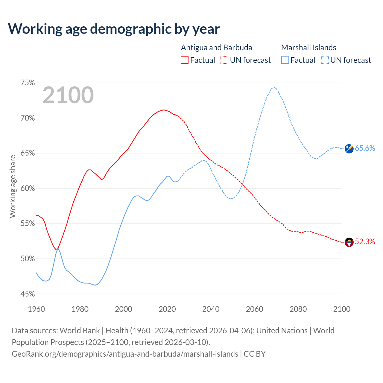 - Antigua and Barbuda has 66.7K working age adults (aged 15-64) vs 21.3K in the Marshall Islands.