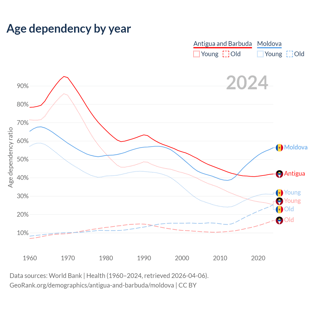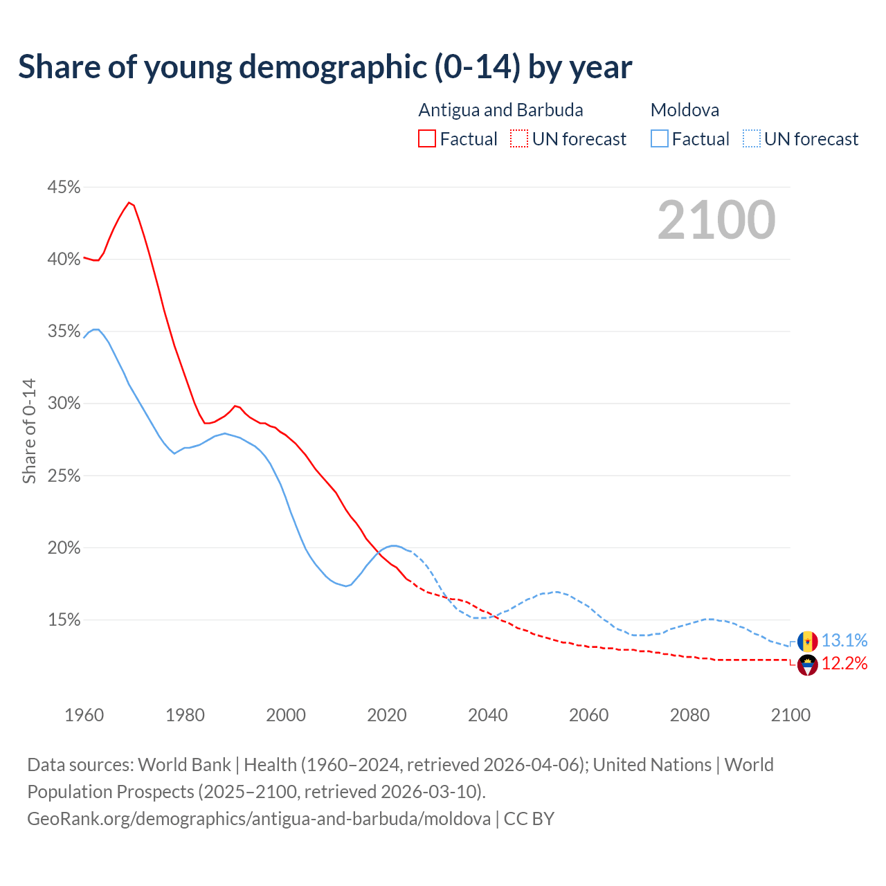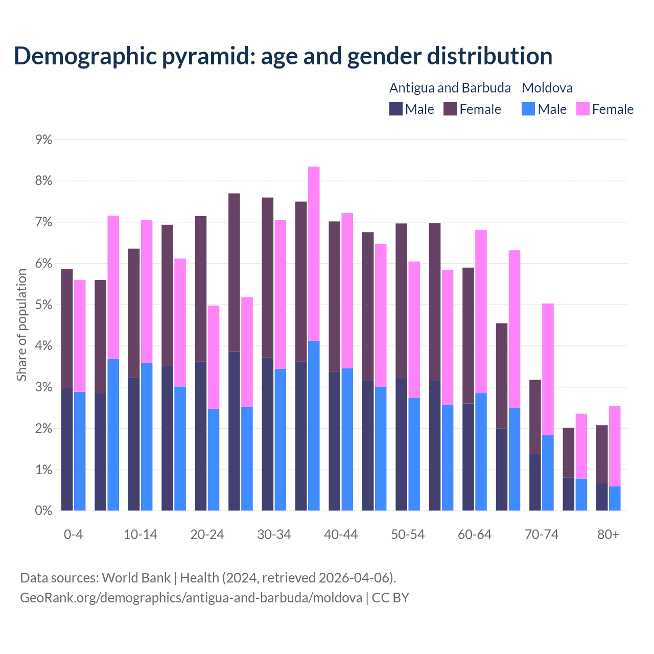 - The share of young demographic (0-15 years old) in Antigua and Barbuda is 17.8% vs 19.8% in Moldova.