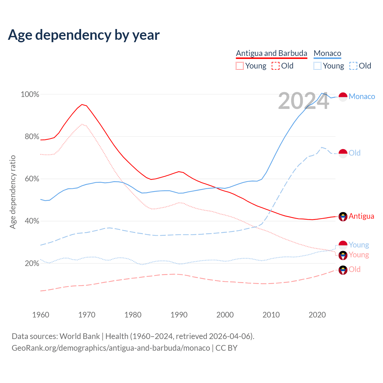 - Antigua and Barbuda is ranked 67/196 by median age (oldest to youngest) vs 1/196 for Monaco.