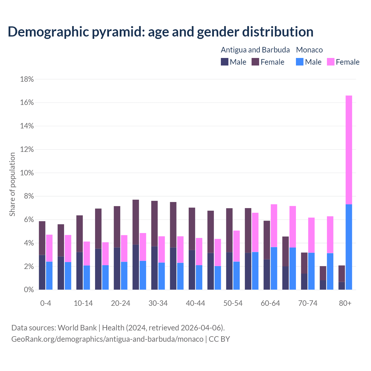 - The share of old-age demographic (65+) in Antigua and Barbuda is 11.8% vs 36.2% in Monaco.