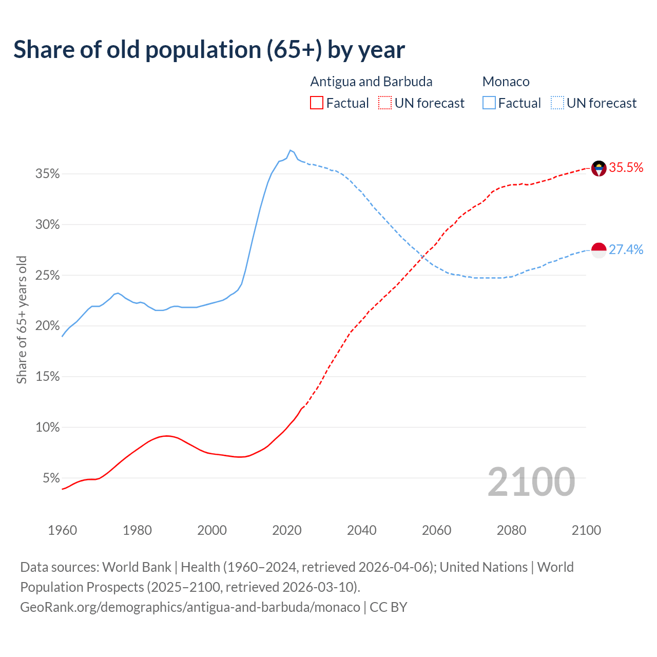The share of older people aged 65 and over is 11.8% in Antigua and Barbuda and 36.2% in Monaco. Life expectancy in Antigua and Barbuda compared to Monaco .