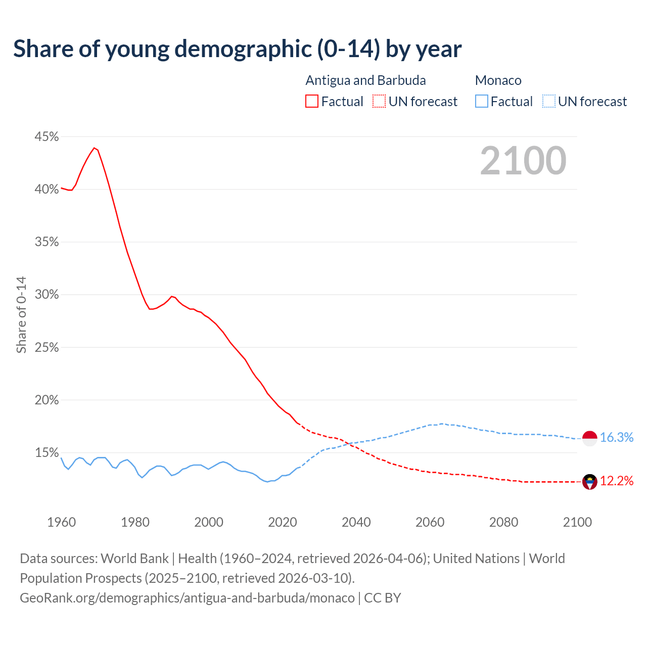 - The share of young demographic (0-15 years old) in Antigua and Barbuda is 17.8% vs 13.5% in Monaco.