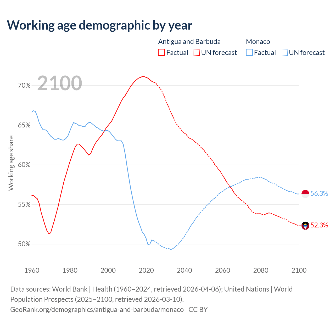 - Antigua and Barbuda has 66.7K working age adults (aged 15-64) vs 19.2K in Monaco.