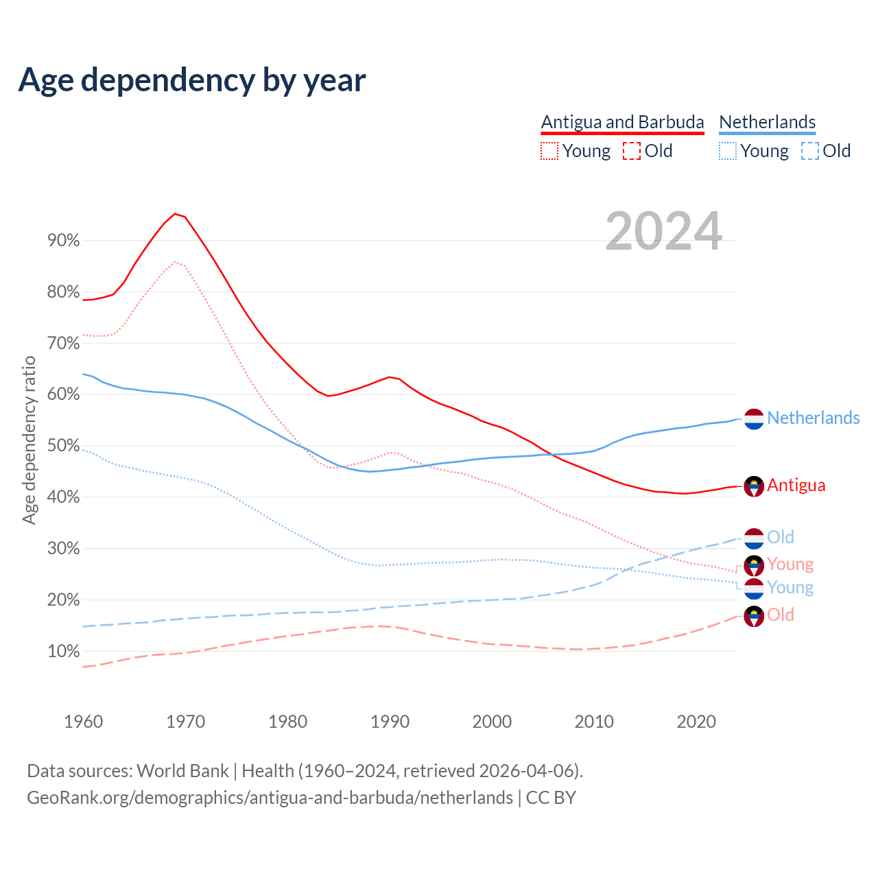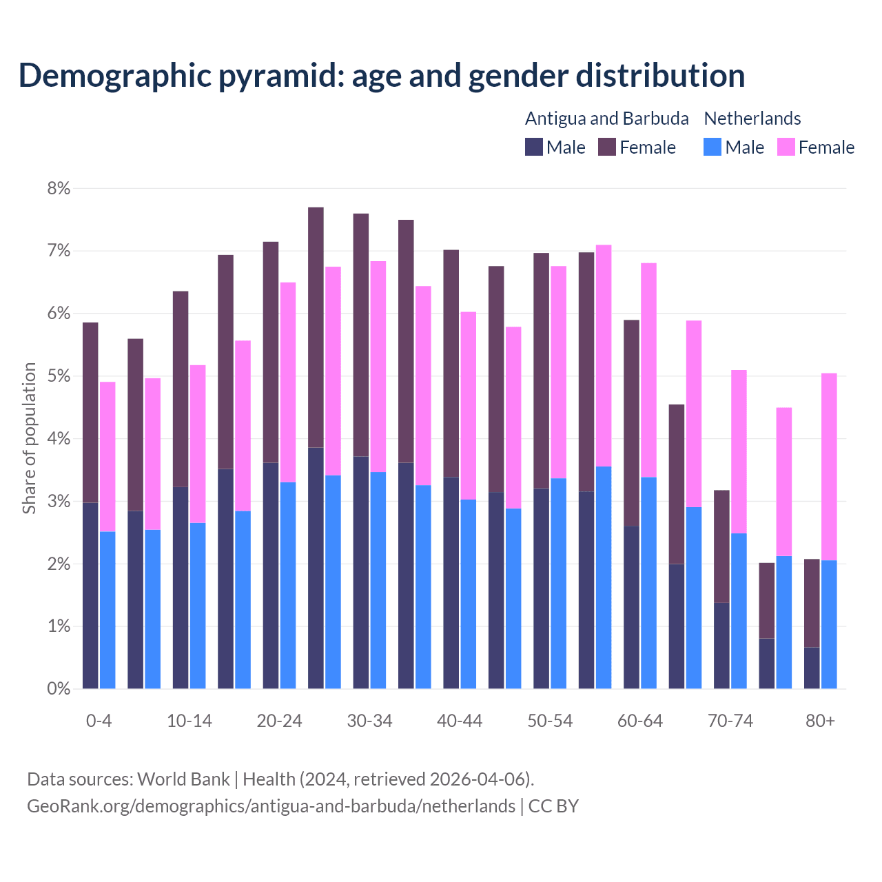 - The share of old-age demographic (65+) in Antigua and Barbuda is 11.8% vs 20.5% in the Netherlands.