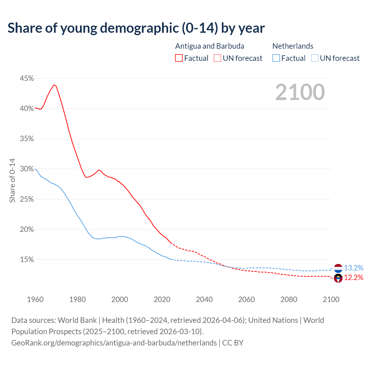 - The share of young demographic (0-15 years old) in Antigua and Barbuda is 17.8% vs 15% in the Netherlands.
