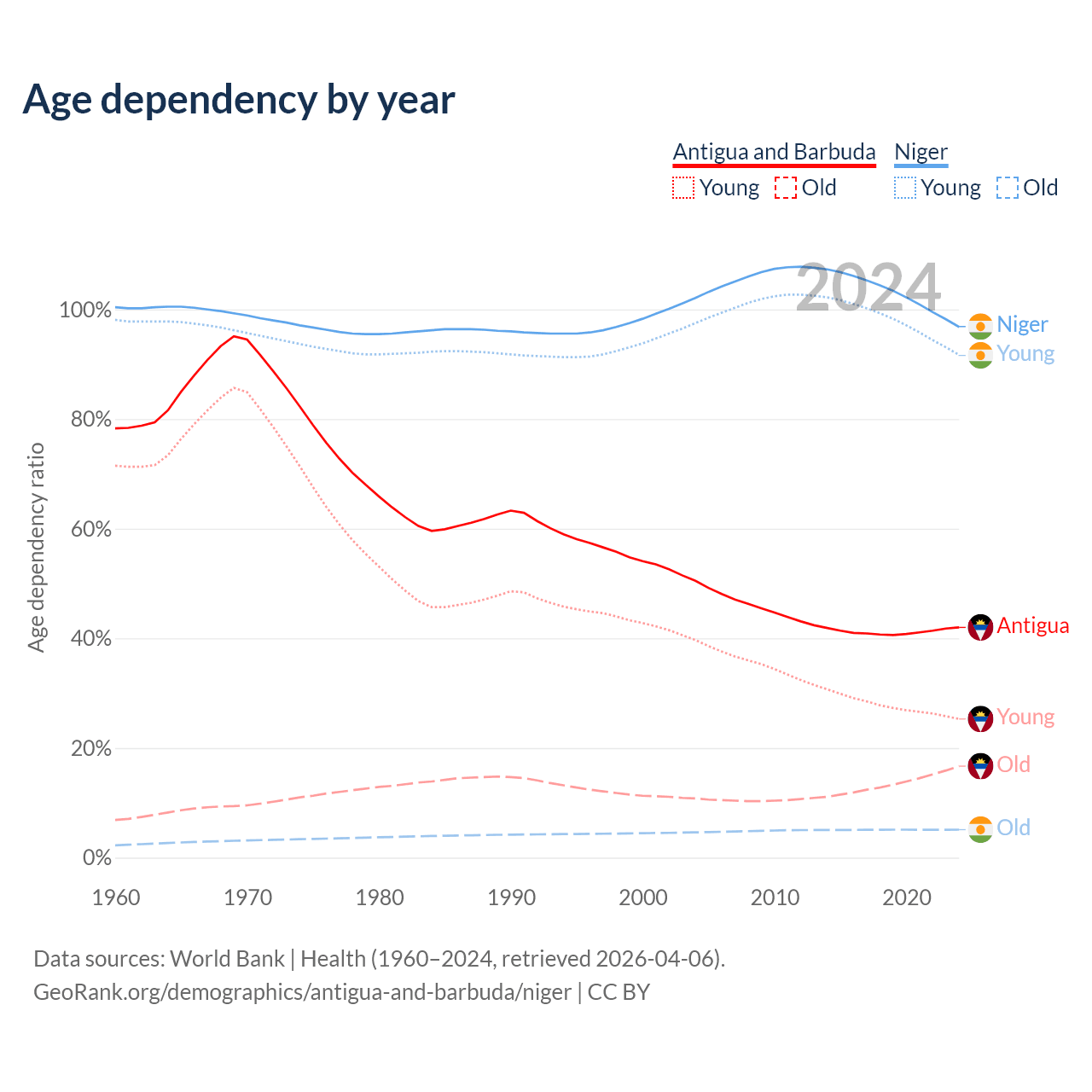 - Antigua and Barbuda is ranked 67/196 by median age (oldest to youngest) vs 195/196 for Niger.