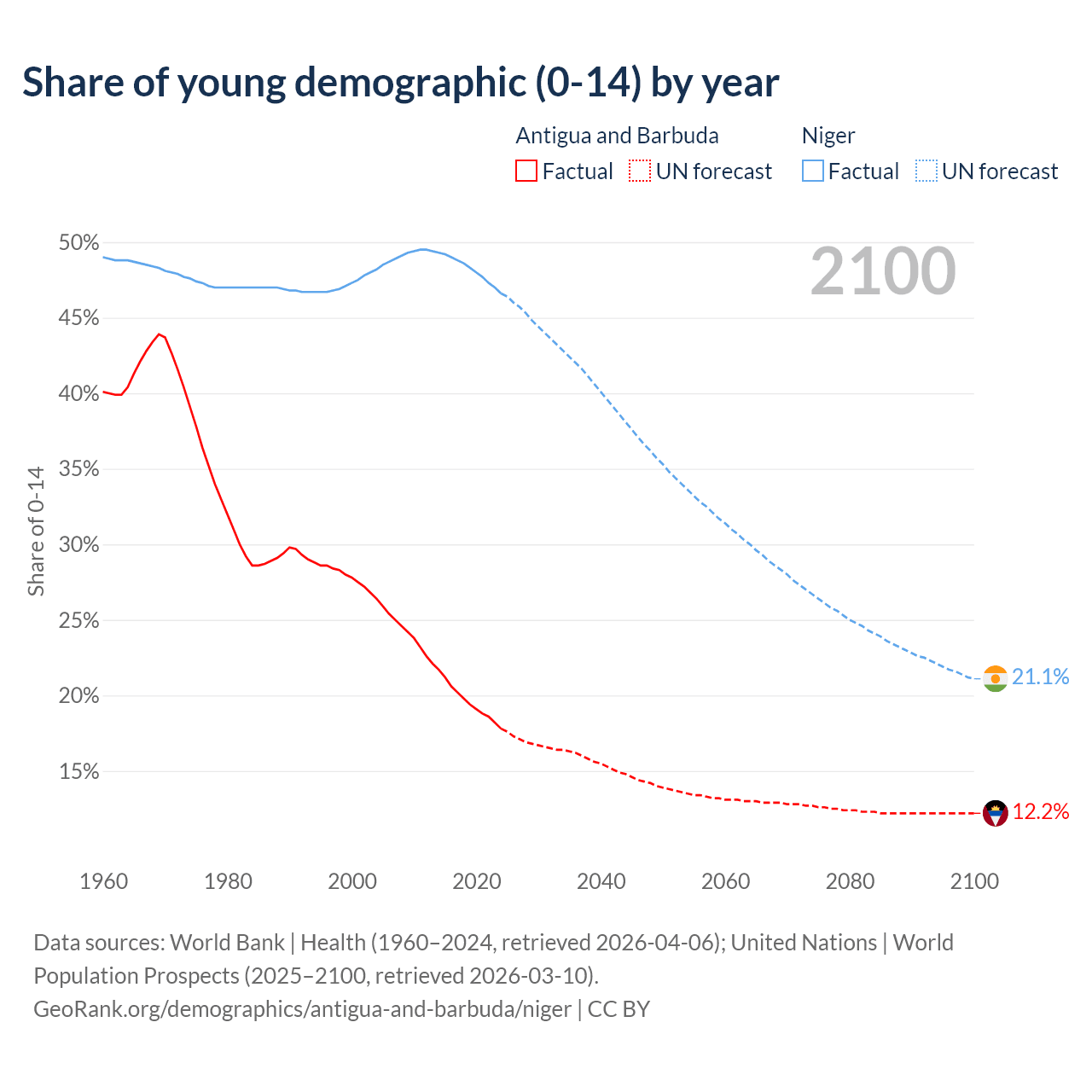 - The share of young demographic (0-15 years old) in Antigua and Barbuda is 17.8% vs 46.6% in Niger.