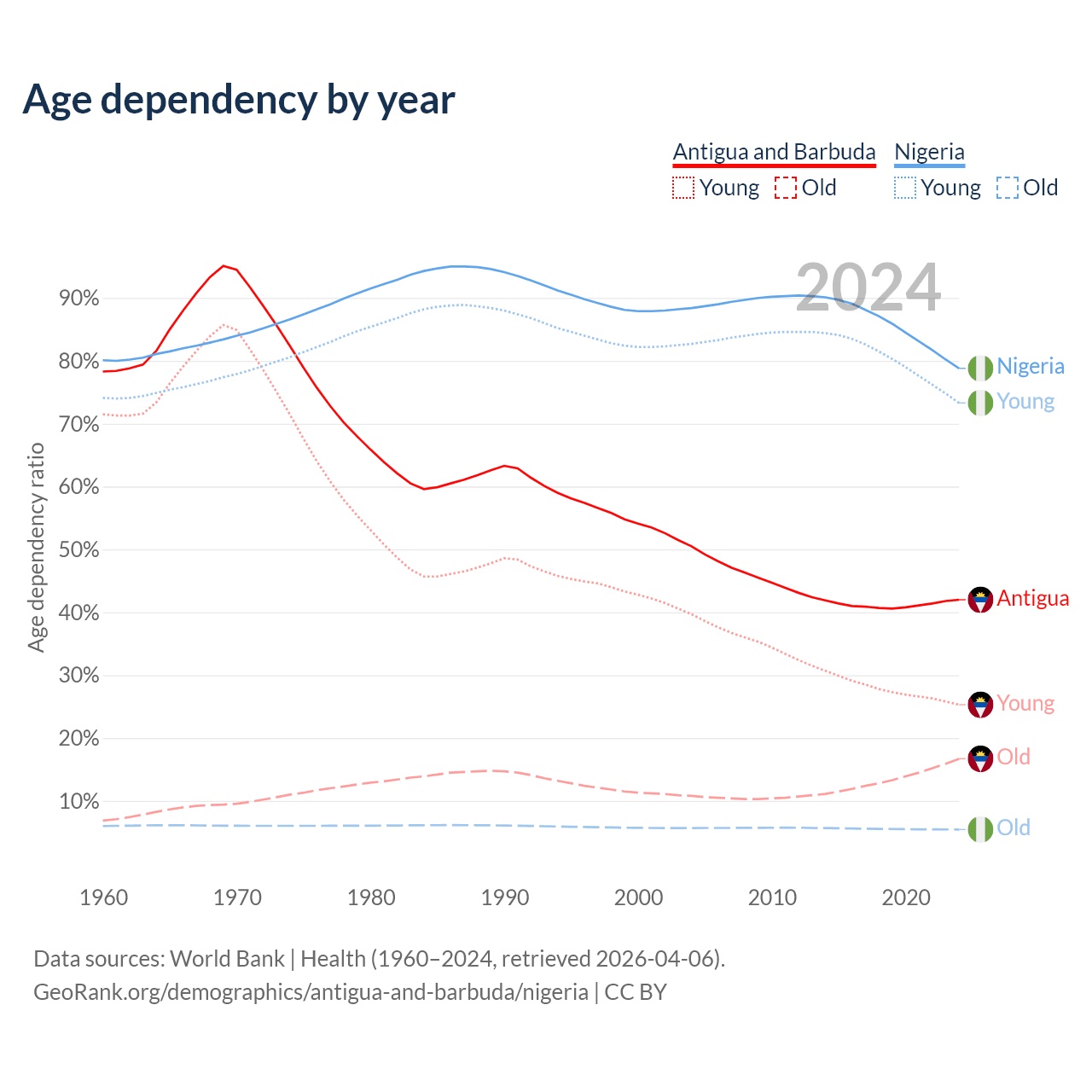 The share of older people aged 65 and over is 11.8% in Antigua and Barbuda and 3.05% in Nigeria. Life expectancy in Antigua and Barbuda compared to Nigeria .