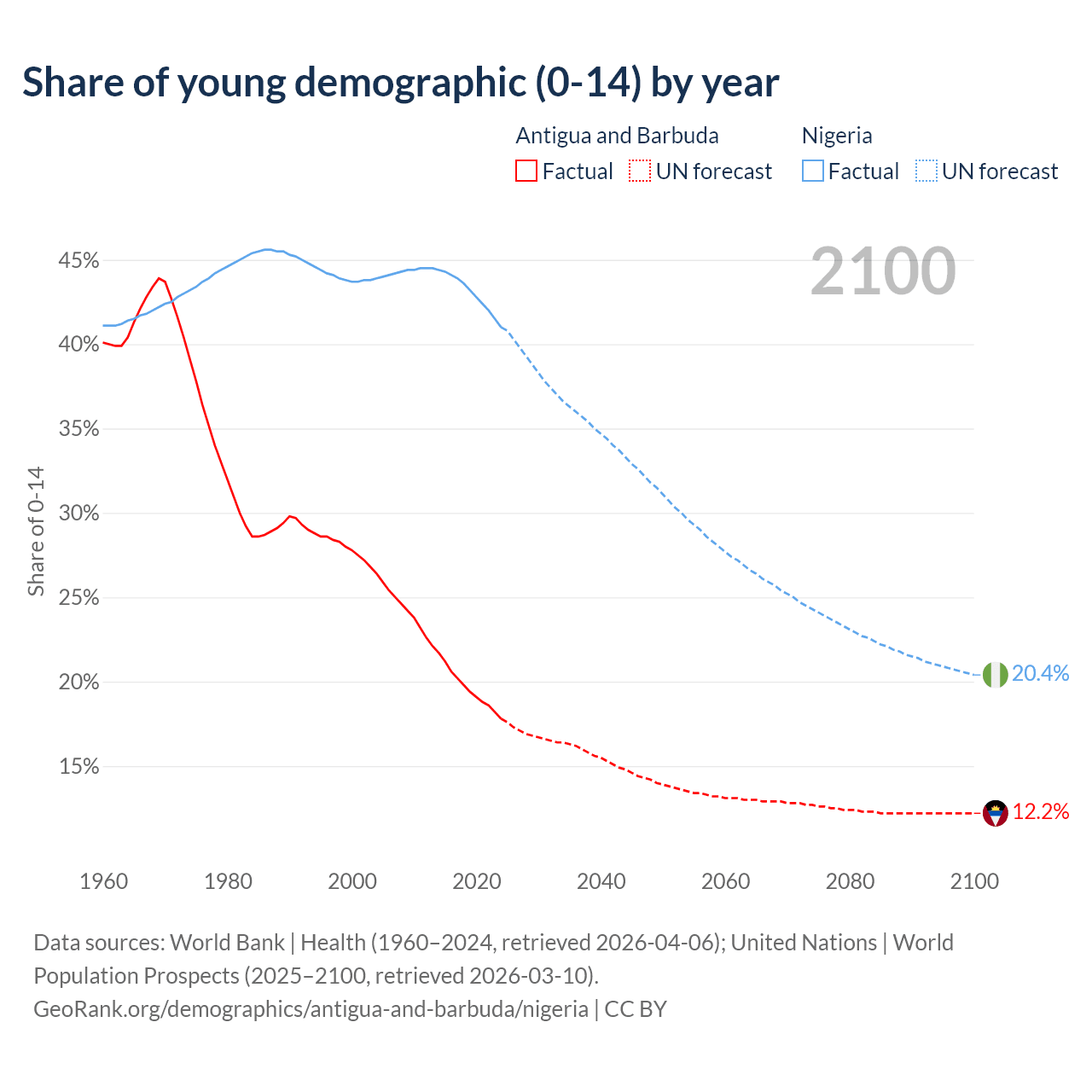 - The share of young demographic (0-15 years old) in Antigua and Barbuda is 17.8% vs 41% in Nigeria.