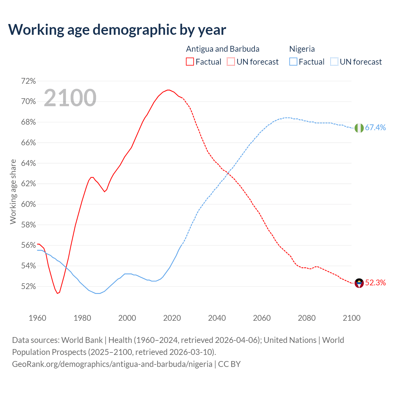 - Antigua and Barbuda has 66.7K working age adults (aged 15-64) vs 136M in Nigeria.