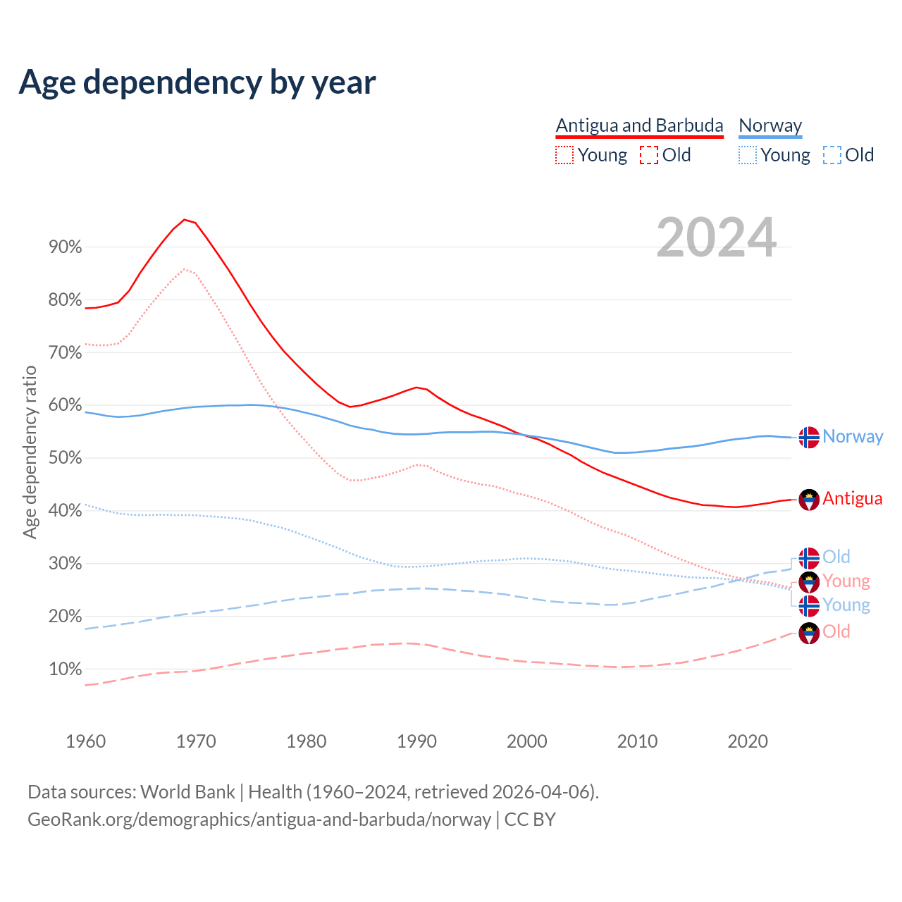 The share of older people aged 65 and over is 11.8% in Antigua and Barbuda and 18.8% in Norway. Life expectancy in Antigua and Barbuda compared to Norway .