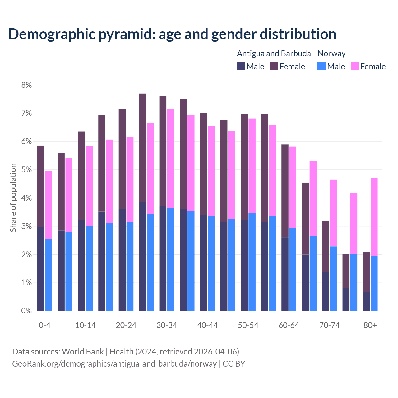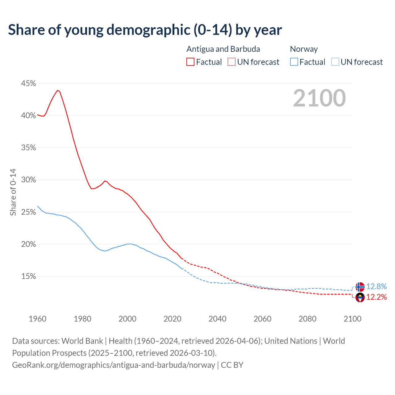- The share of young demographic (0-15 years old) in Antigua and Barbuda is 17.8% vs 16.2% in Norway.