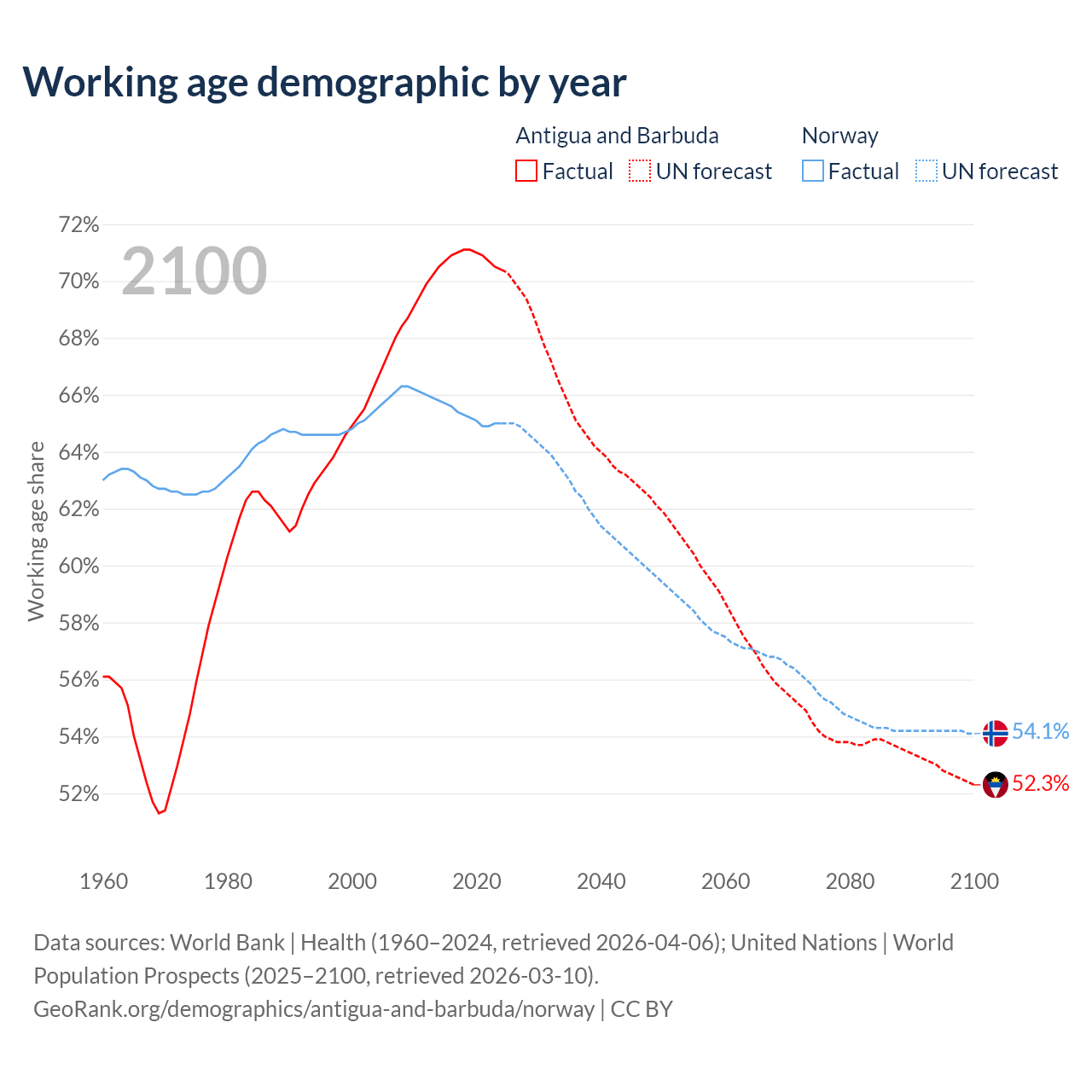 - Antigua and Barbuda has 66.7K working age adults (aged 15-64) vs 3.69M in Norway.