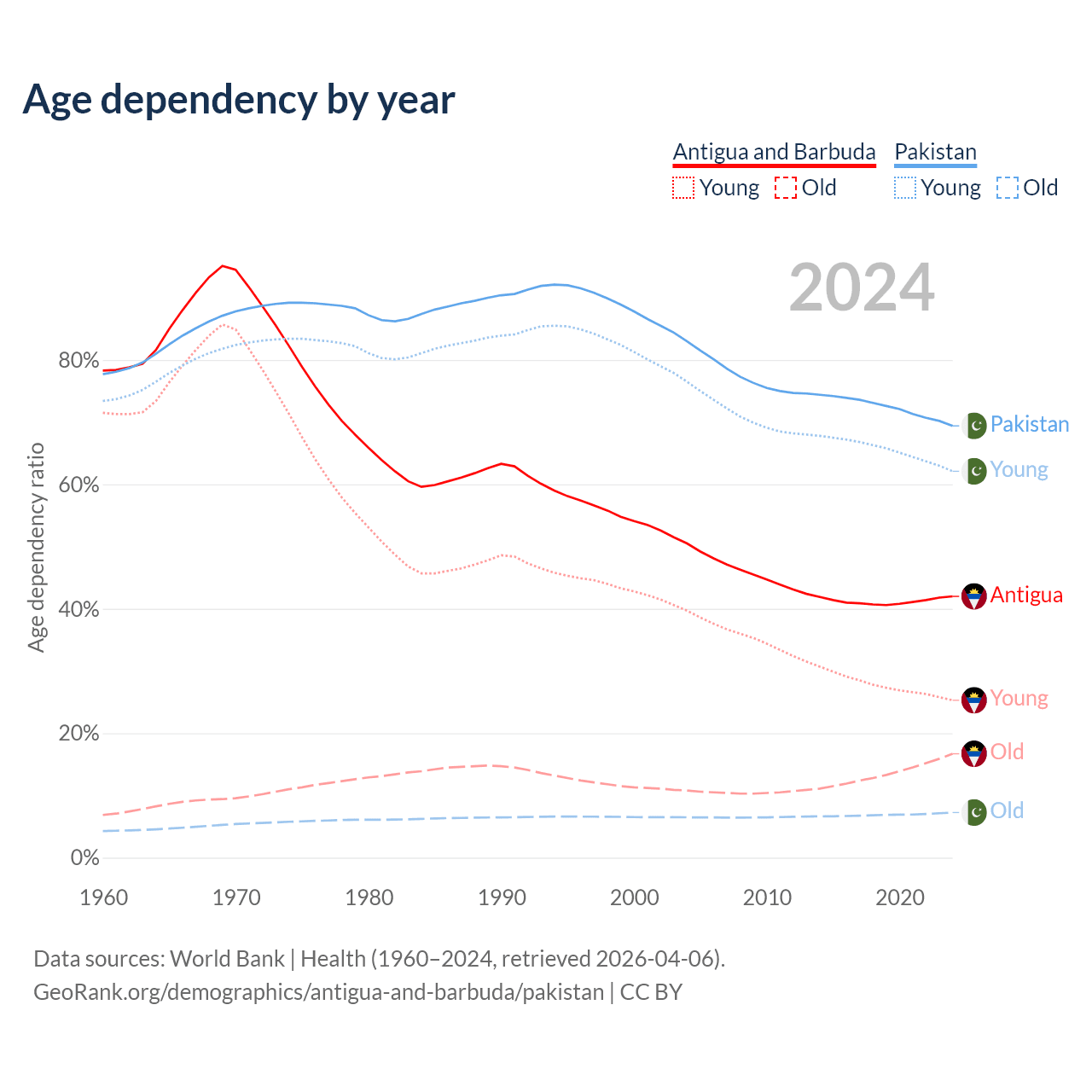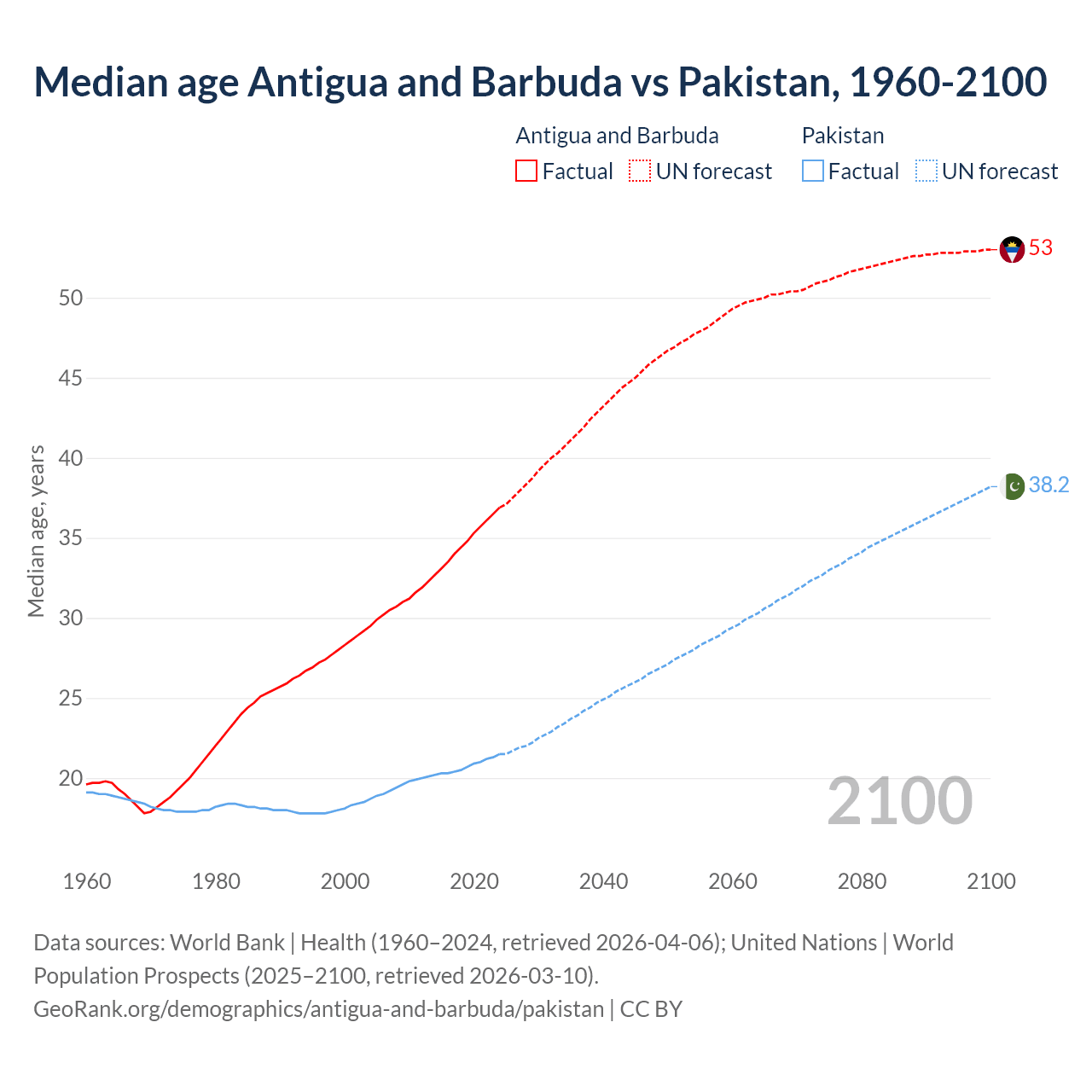 - Antigua and Barbuda is ranked 67/196 by median age (oldest to youngest) vs 154/196 for Pakistan.