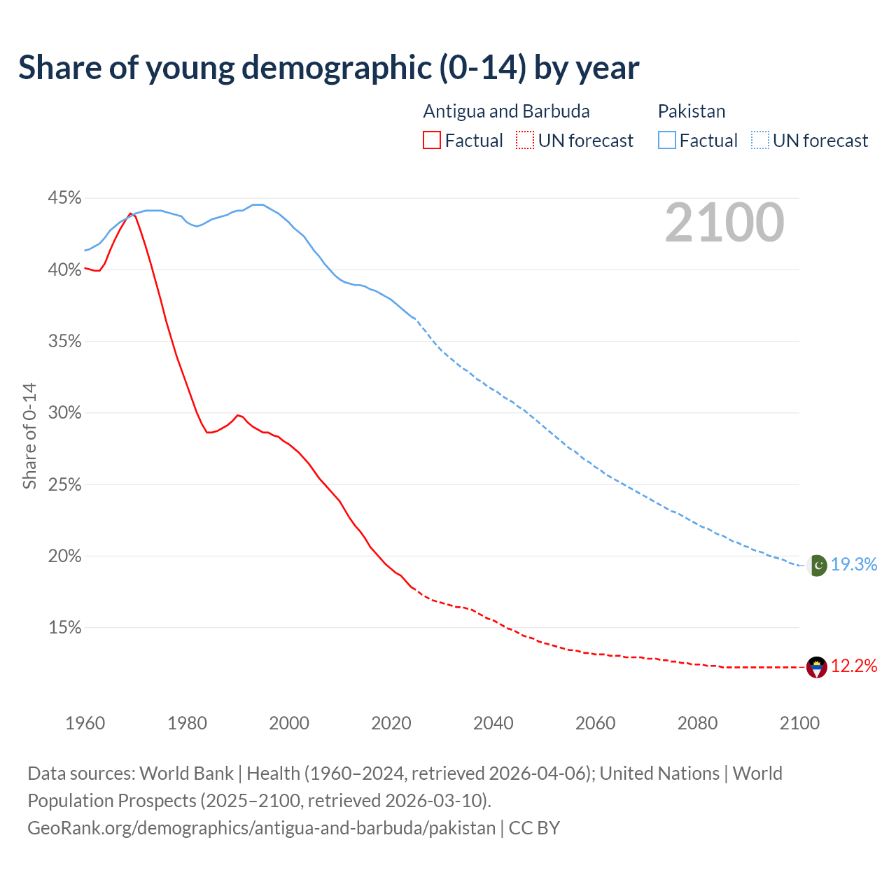 - The share of young demographic (0-15 years old) in Antigua and Barbuda is 17.8% vs 36.7% in Pakistan.