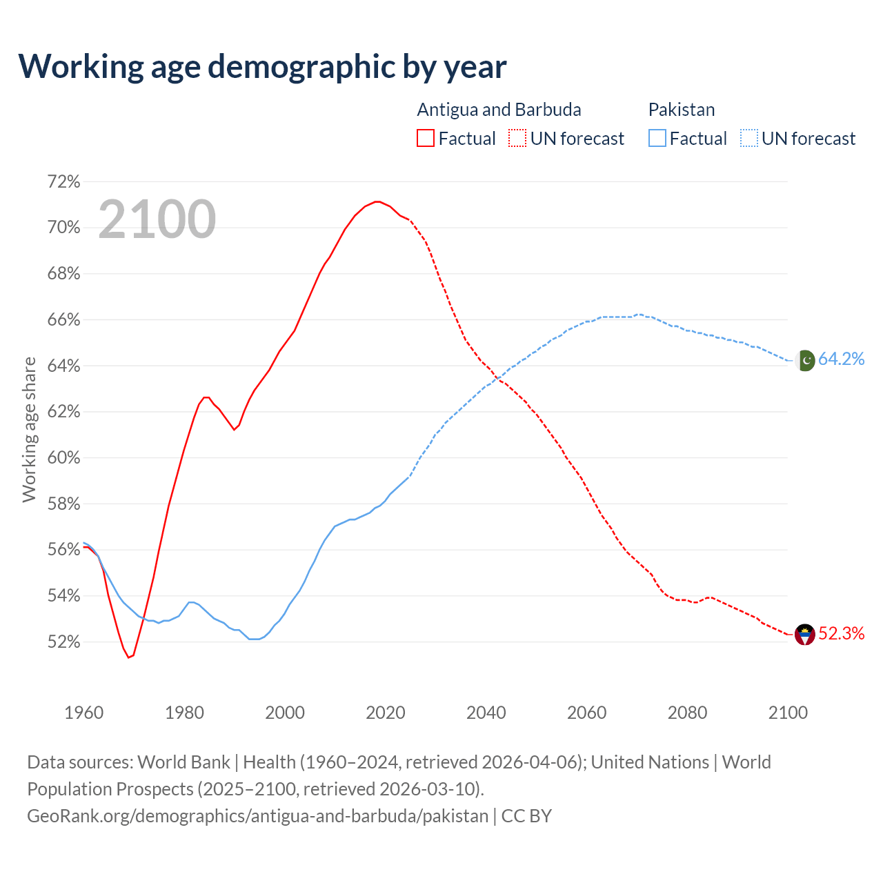 - Antigua and Barbuda has 66.7K working age adults (aged 15-64) vs 154M in Pakistan.