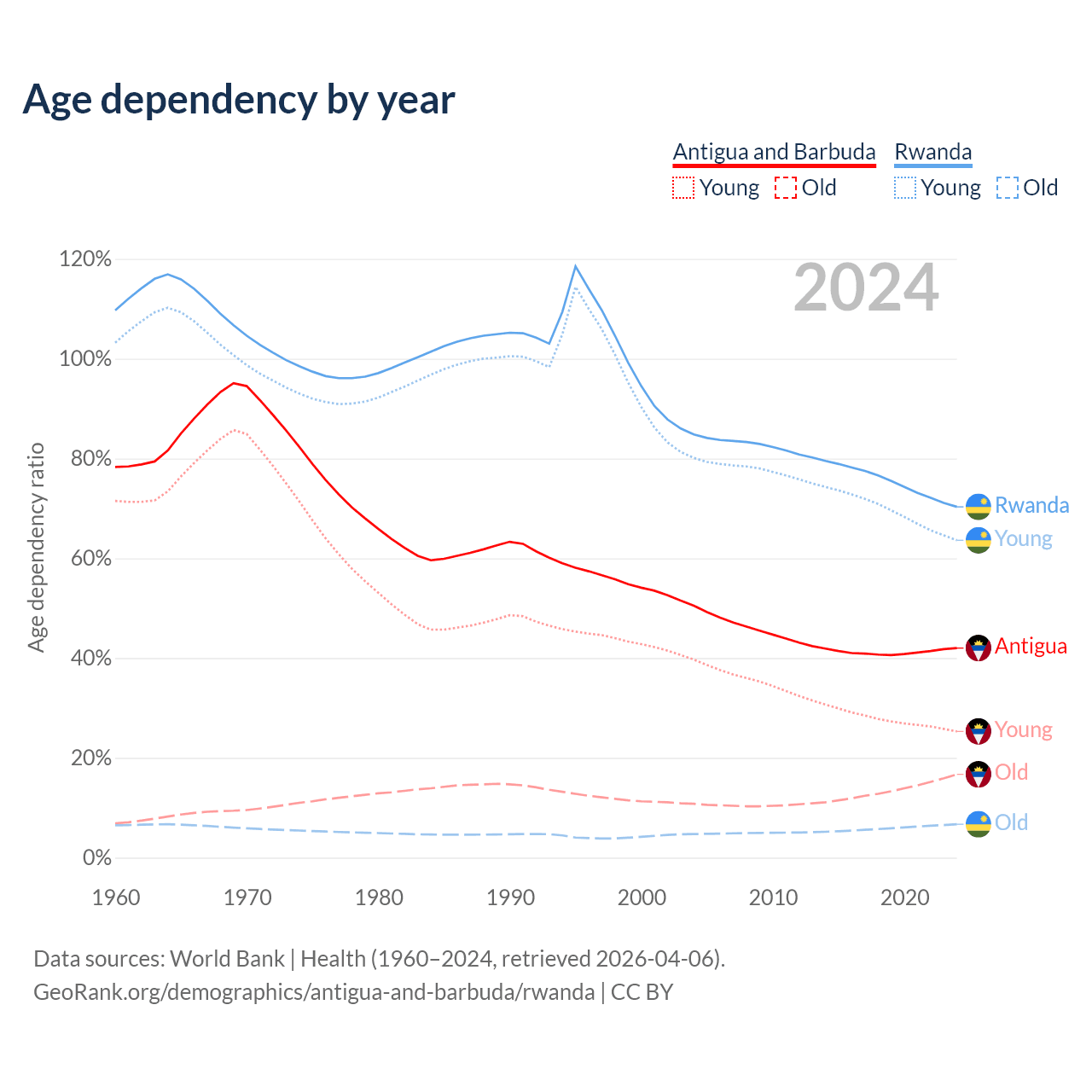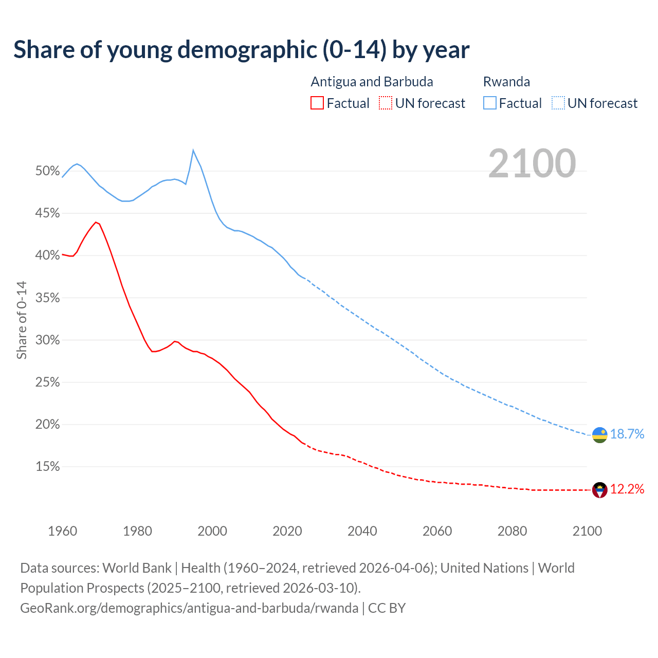 - The share of young demographic (0-15 years old) in Antigua and Barbuda is 17.8% vs 37.4% in Rwanda.
