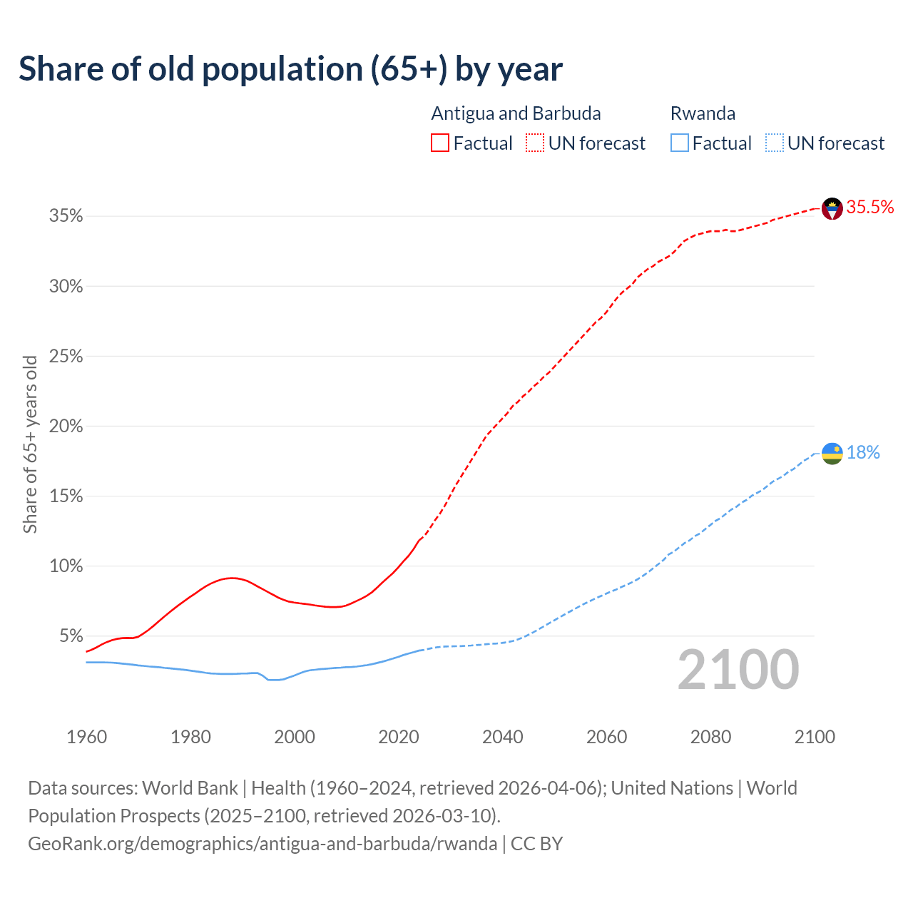 The share of older people aged 65 and over is 11.8% in Antigua and Barbuda and 3.93% in Rwanda. Life expectancy in Antigua and Barbuda compared to Rwanda .