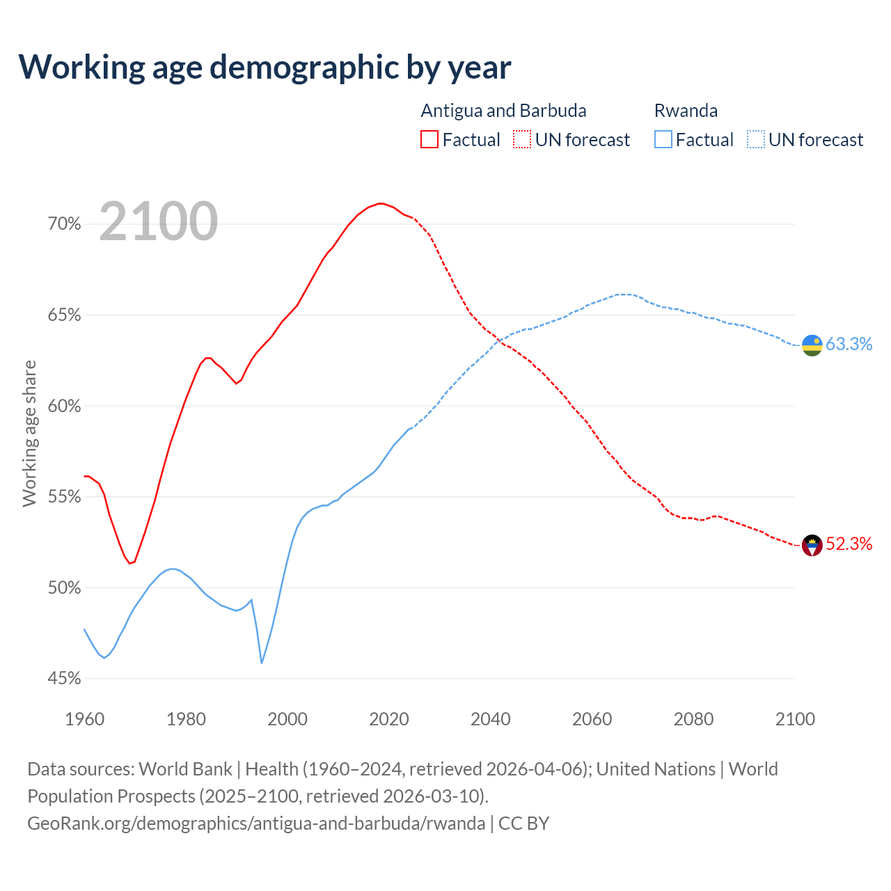 - Antigua and Barbuda has 66.7K working age adults (aged 15-64) vs 8.79M in Rwanda.
