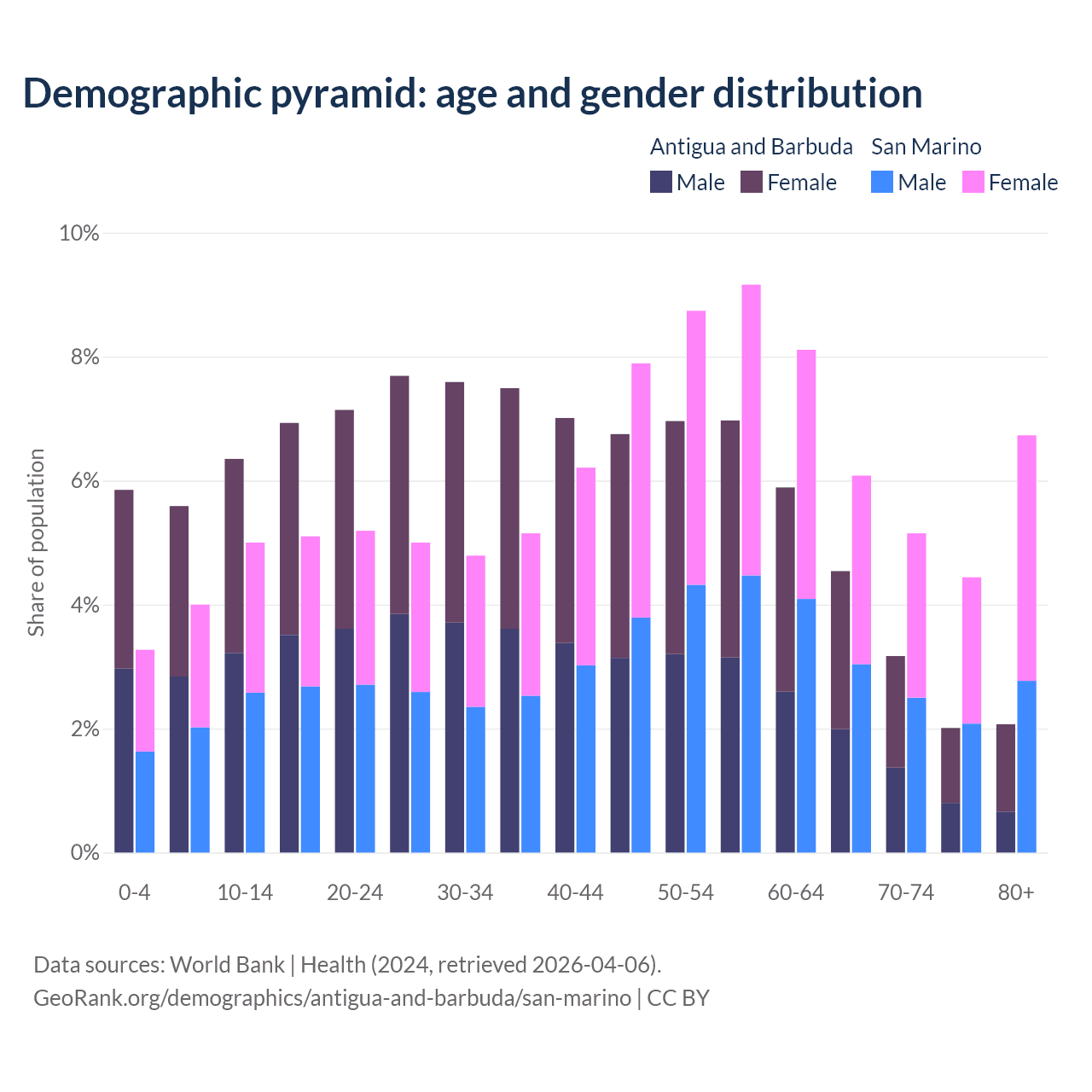 - Antigua and Barbuda is ranked 67/196 by median age (oldest to youngest) vs 3/196 for San Marino.