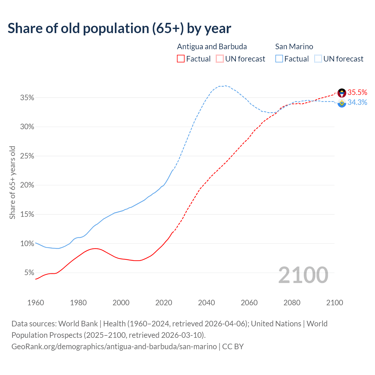 The share of older people aged 65 and over is 11.8% in Antigua and Barbuda and 22.4% in San Marino. Life expectancy in Antigua and Barbuda compared to San Marino .