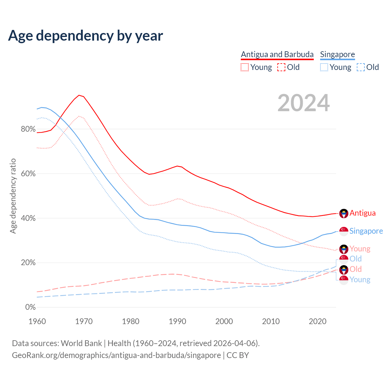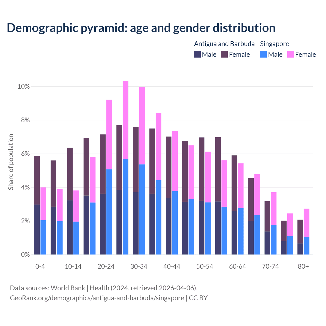 - Antigua and Barbuda is ranked 67/196 by median age (oldest to youngest) vs 68/196 for Singapore.