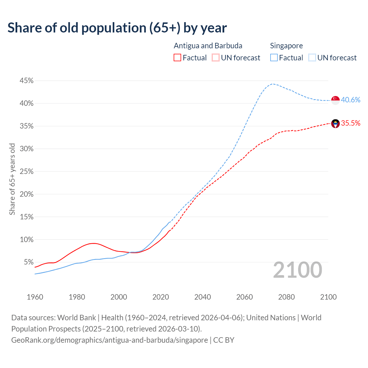 The share of older people aged 65 and over is 11.8% in Antigua and Barbuda and 13.7% in Singapore. Life expectancy in Antigua and Barbuda compared to Singapore .