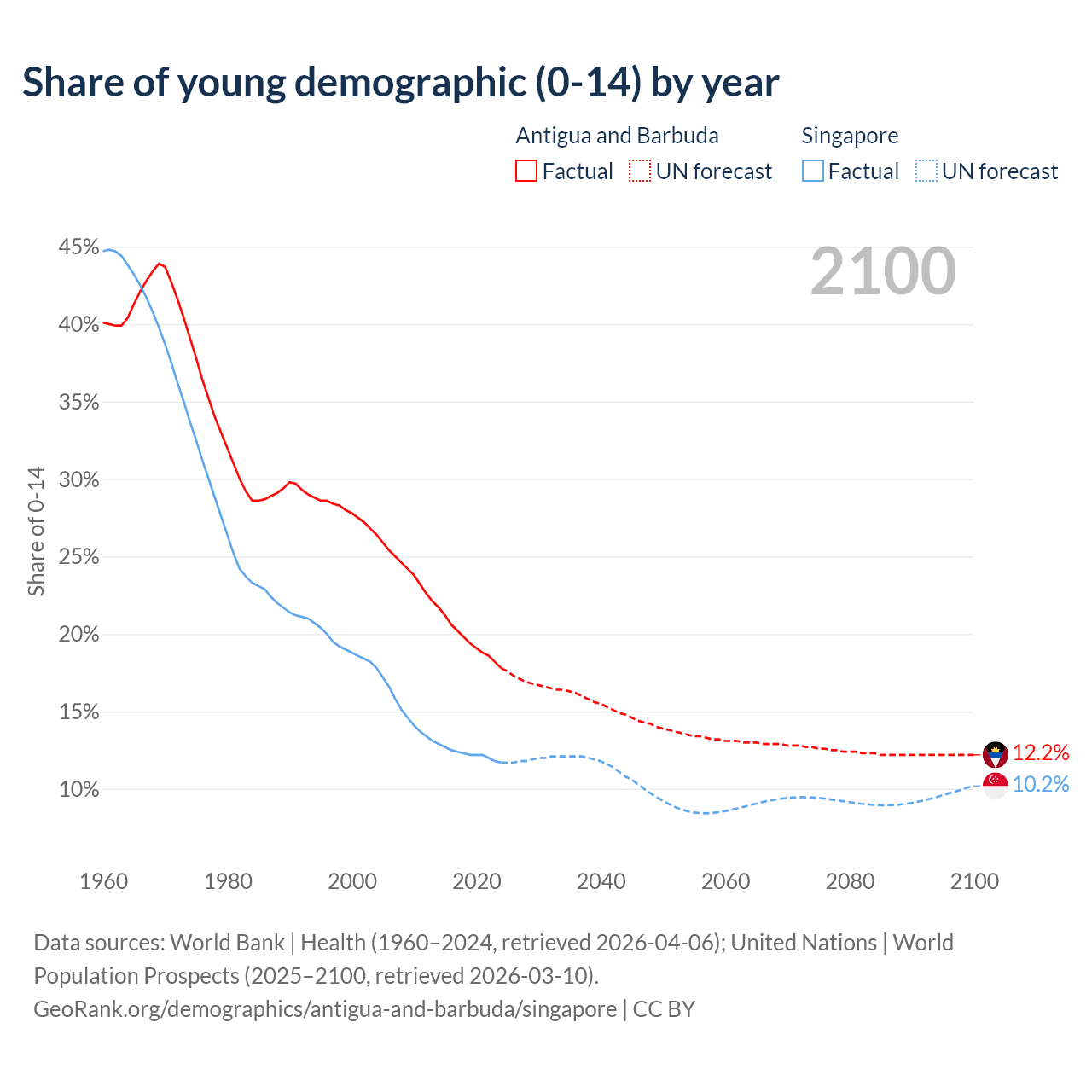 - The share of young demographic (0-15 years old) in Antigua and Barbuda is 17.8% vs 11.7% in Singapore.