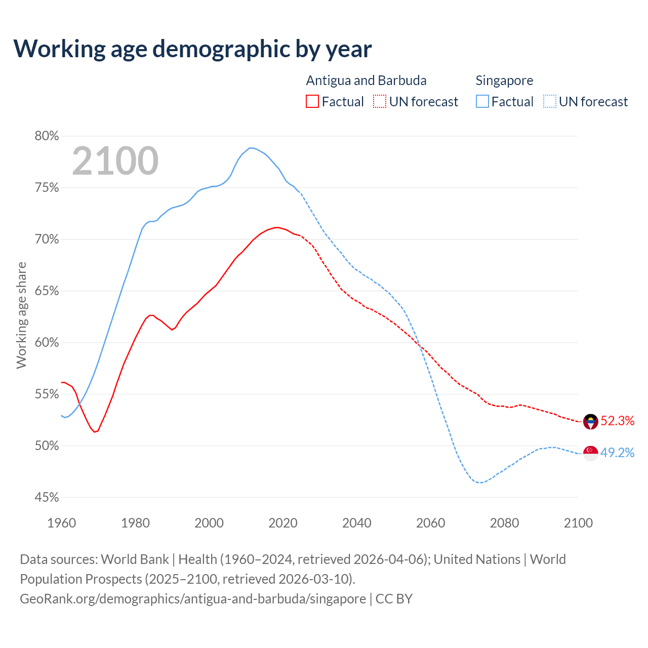 - Antigua and Barbuda has 66.7K working age adults (aged 15-64) vs 4.57M in Singapore.