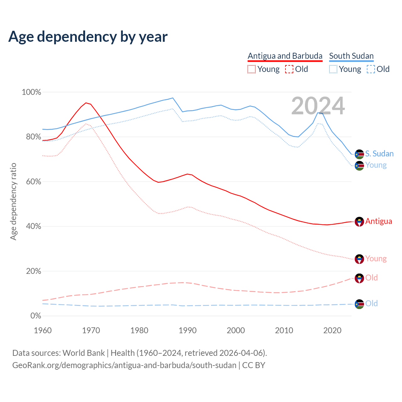 - Antigua and Barbuda is ranked 67/196 by median age (oldest to youngest) vs 173/196 for South Sudan.