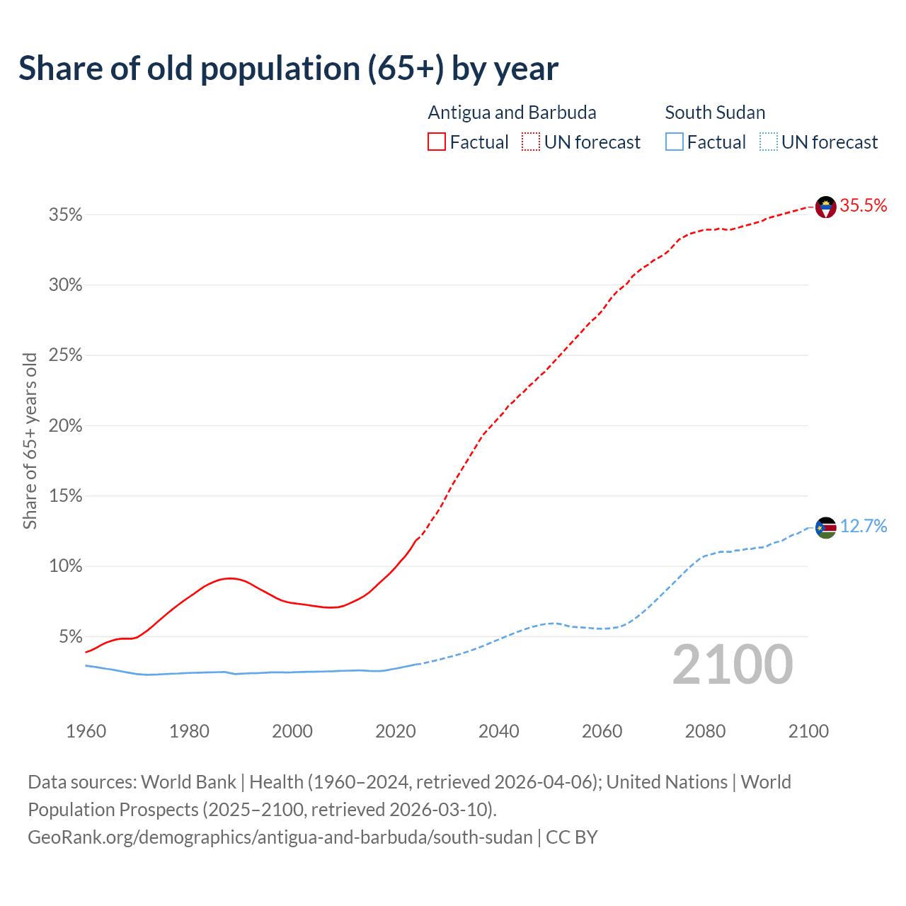 The share of older people aged 65 and over is 11.8% in Antigua and Barbuda and 2.99% in South Sudan. Life expectancy in Antigua and Barbuda compared to South Sudan .