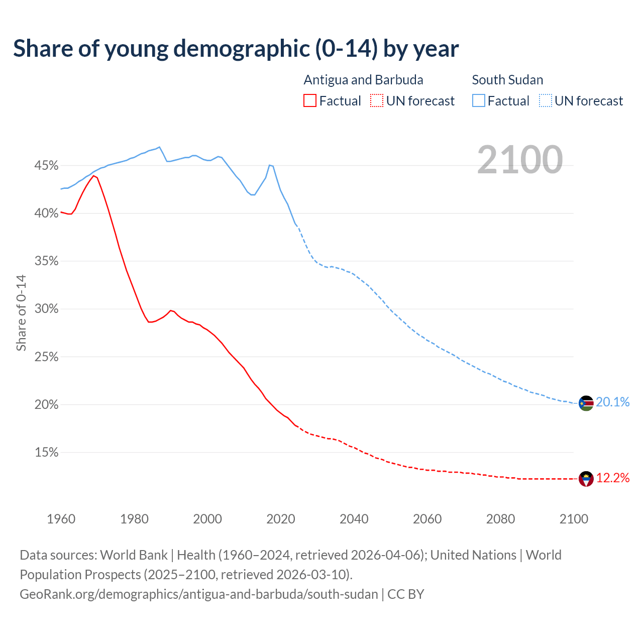 - The share of young demographic (0-15 years old) in Antigua and Barbuda is 17.8% vs 38.9% in South Sudan.