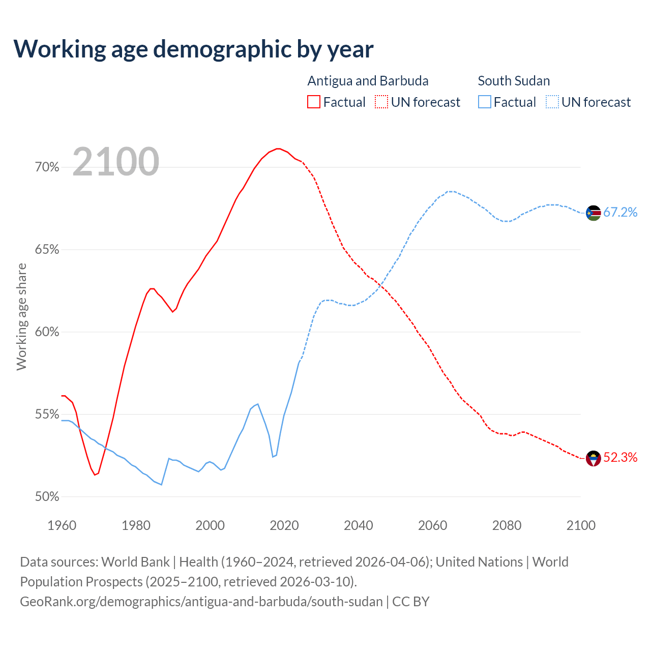 - Antigua and Barbuda has 66.7K working age adults (aged 15-64) vs 7.27M in South Sudan.