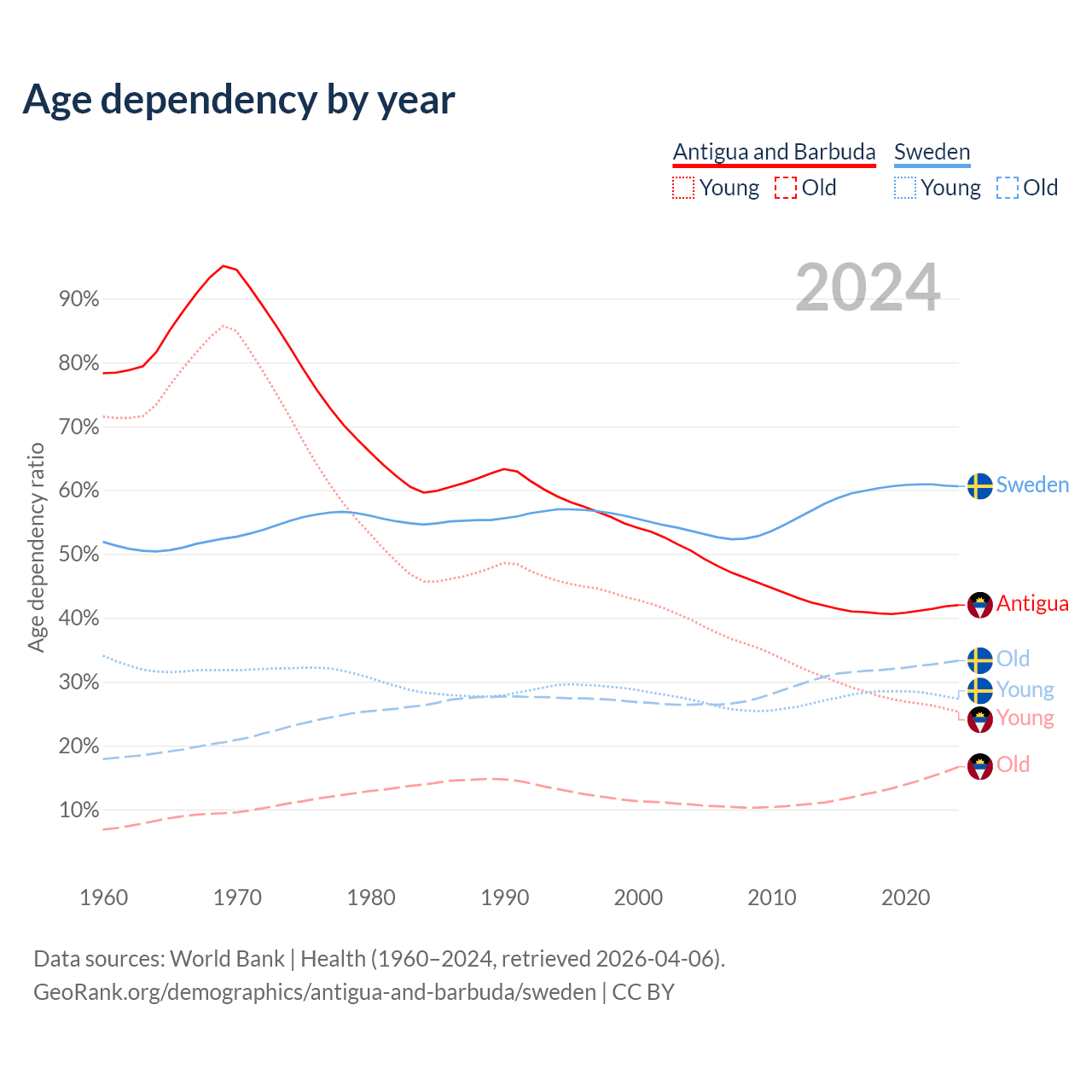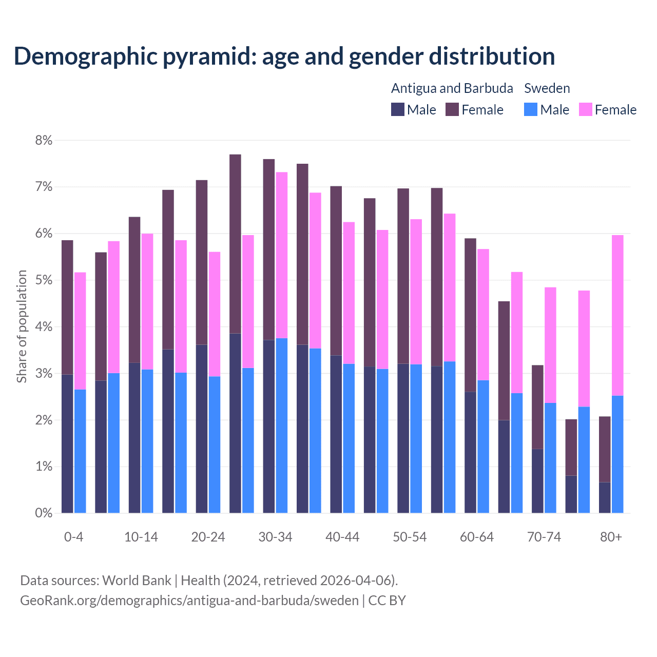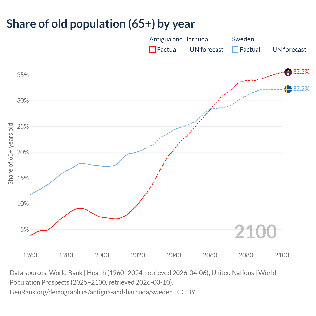 The share of older people aged 65 and over is 11.8% in Antigua and Barbuda and 20.7% in Sweden. Life expectancy in Antigua and Barbuda compared to Sweden .