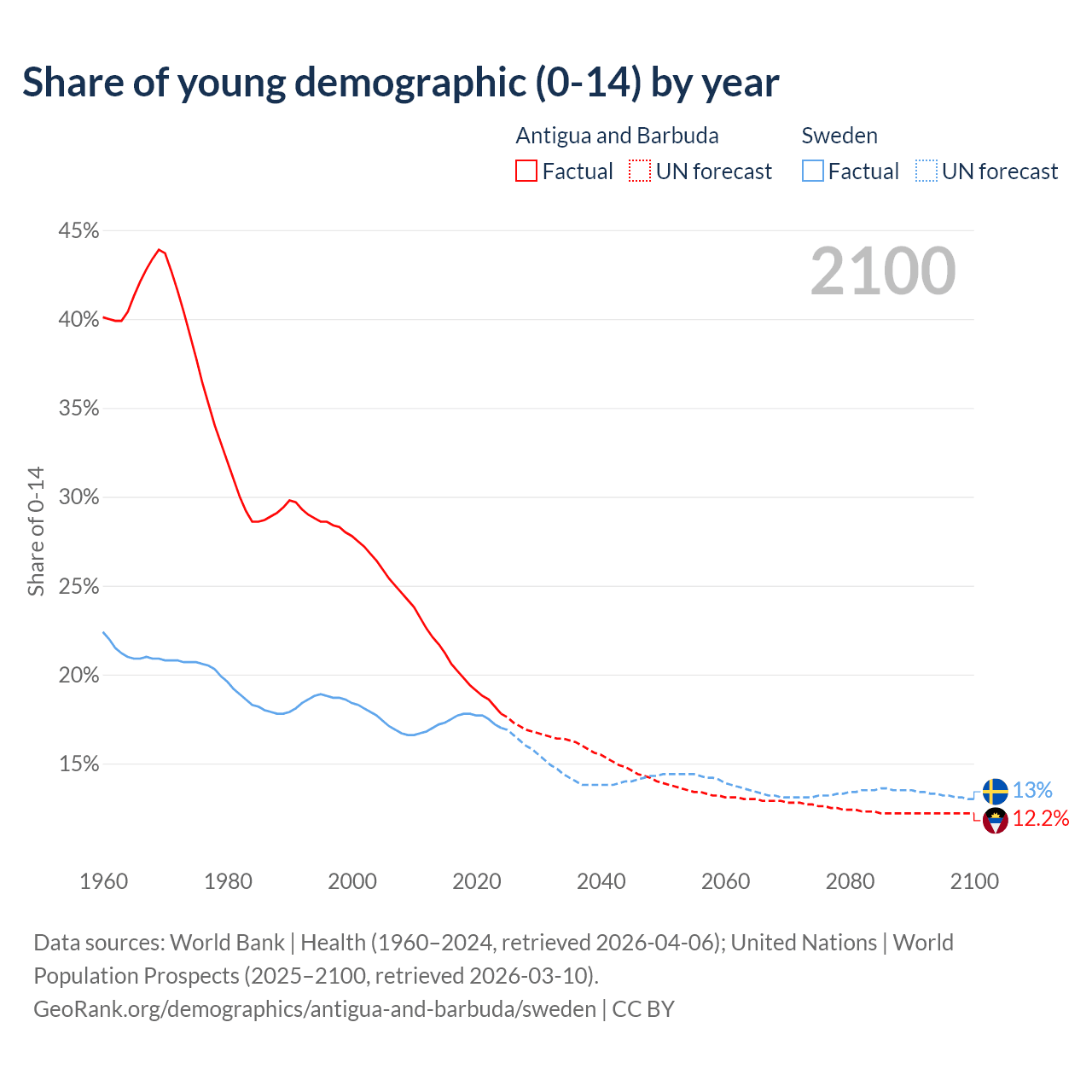 - The share of young demographic (0-15 years old) in Antigua and Barbuda is 17.8% vs 17% in Sweden.