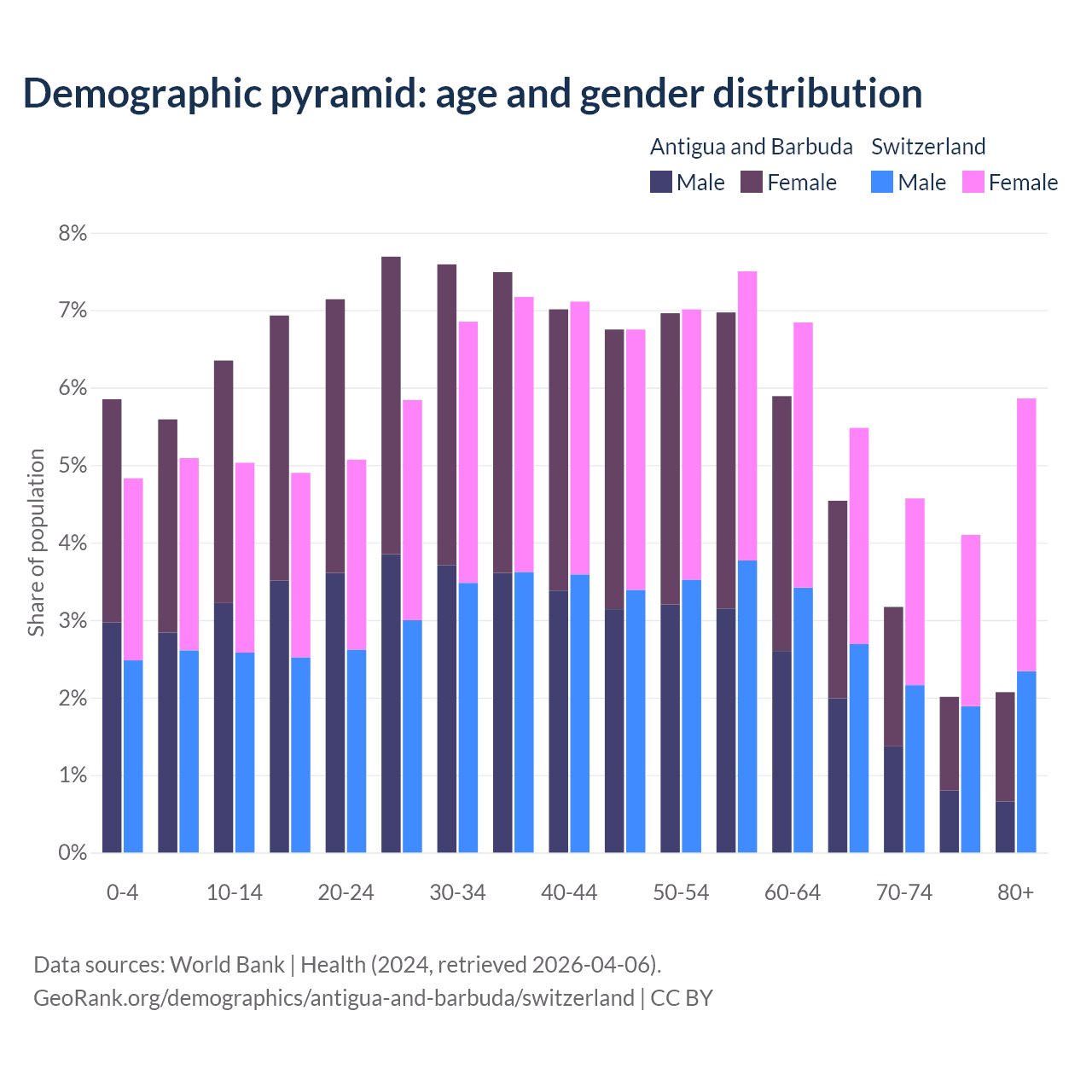 - Antigua and Barbuda is ranked 67/196 by median age (oldest to youngest) vs 24/196 for Switzerland.