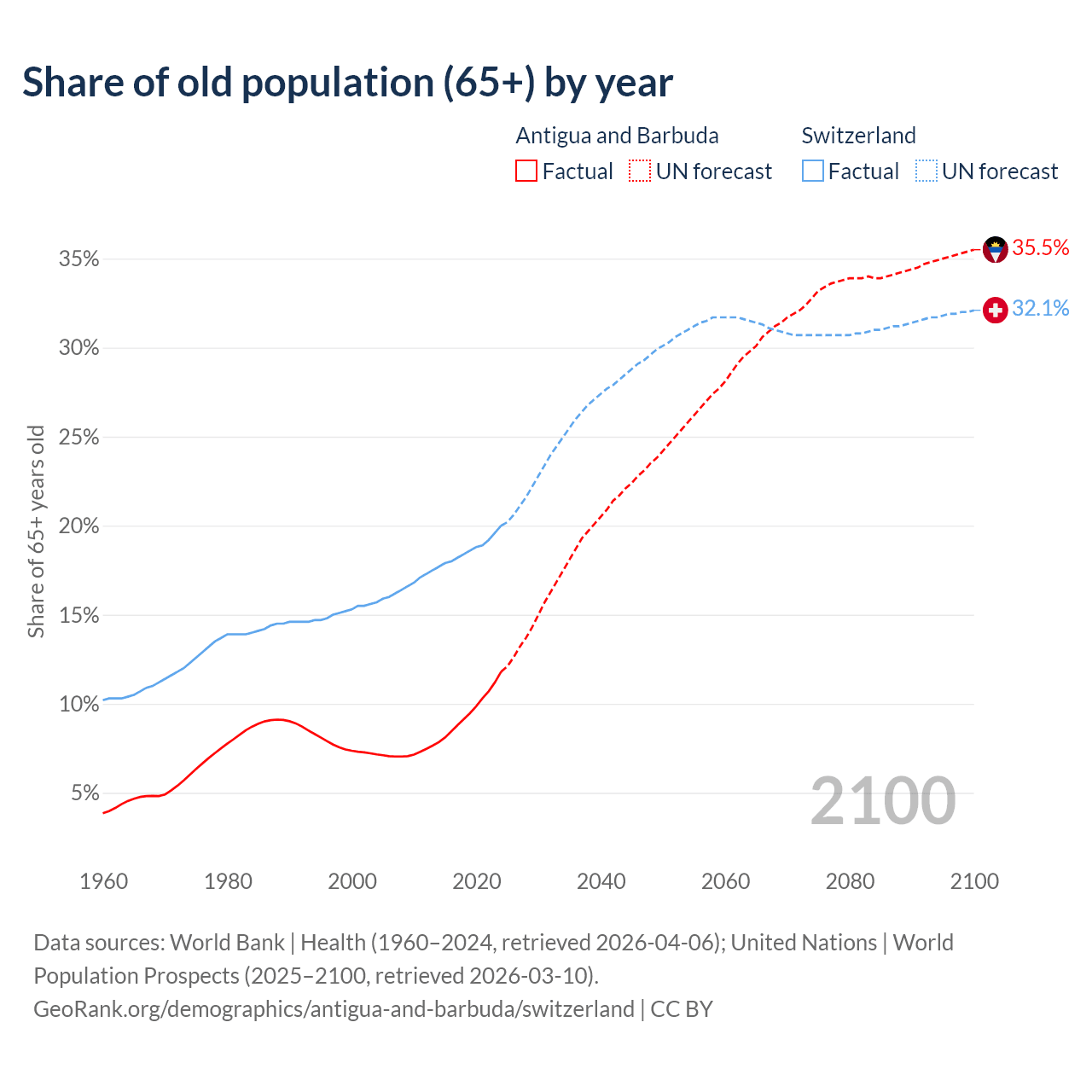 The share of older people aged 65 and over is 11.8% in Antigua and Barbuda and 20% in Switzerland. Life expectancy in Antigua and Barbuda compared to Switzerland .