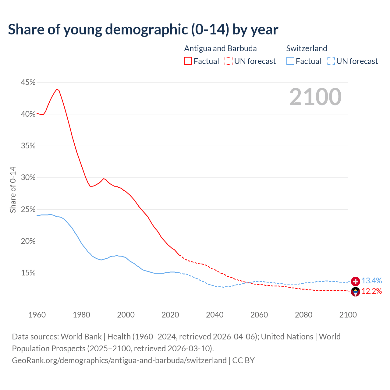 - The share of young demographic (0-15 years old) in Antigua and Barbuda is 17.8% vs 15% in Switzerland.