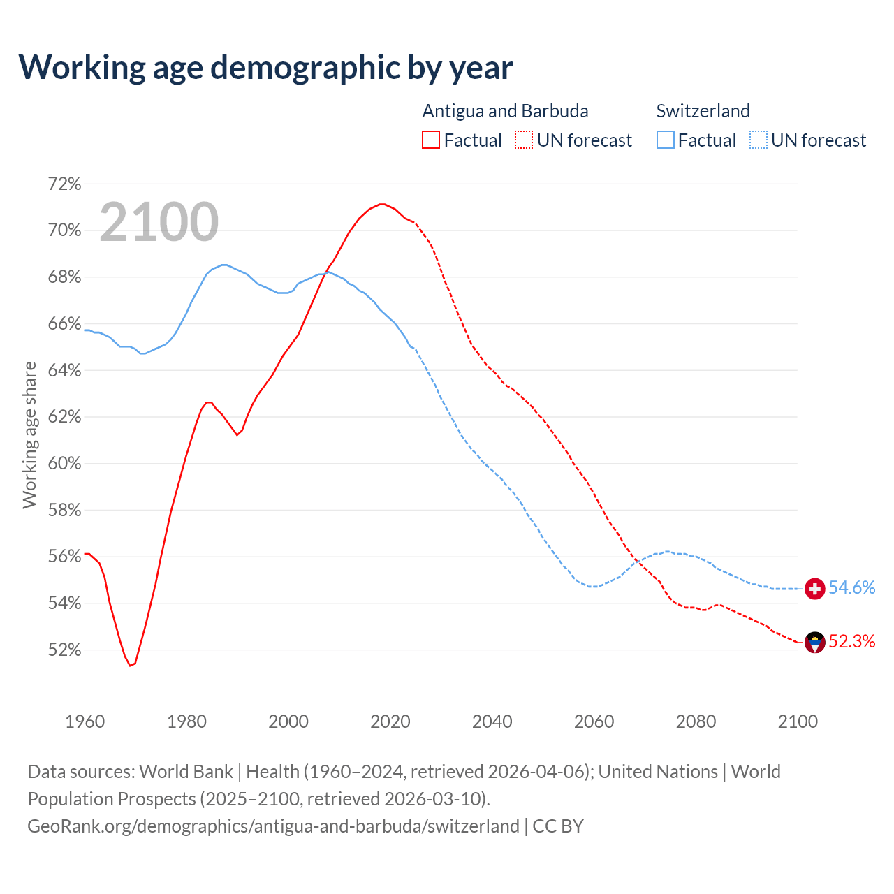 - Antigua and Barbuda has 66.7K working age adults (aged 15-64) vs 5.92M in Switzerland.