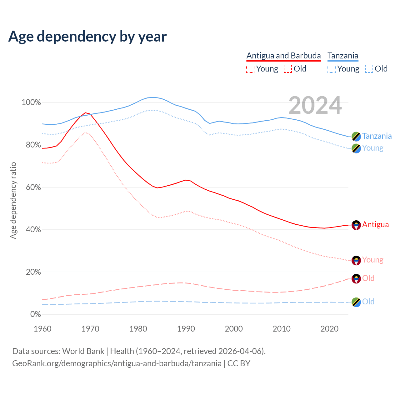 - Antigua and Barbuda is ranked 67/196 by median age (oldest to youngest) vs 184/196 for Tanzania.