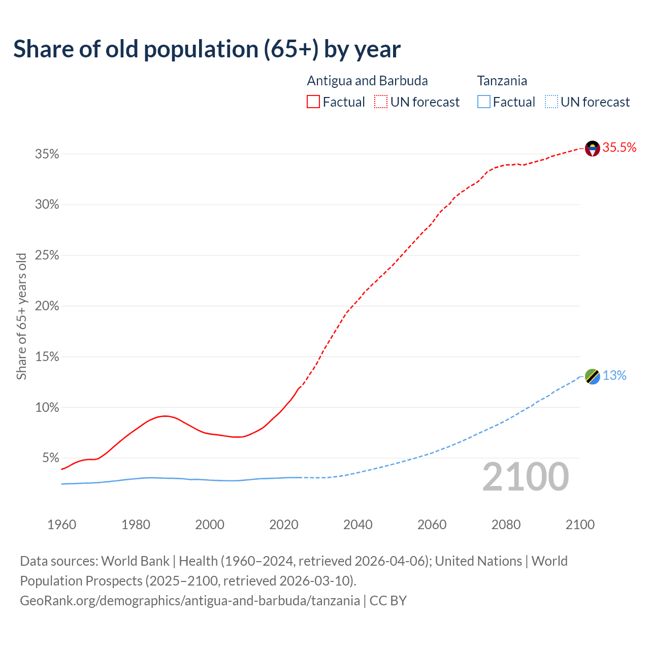 The share of older people aged 65 and over is 11.8% in Antigua and Barbuda and 3.05% in Tanzania. Life expectancy in Antigua and Barbuda compared to Tanzania .