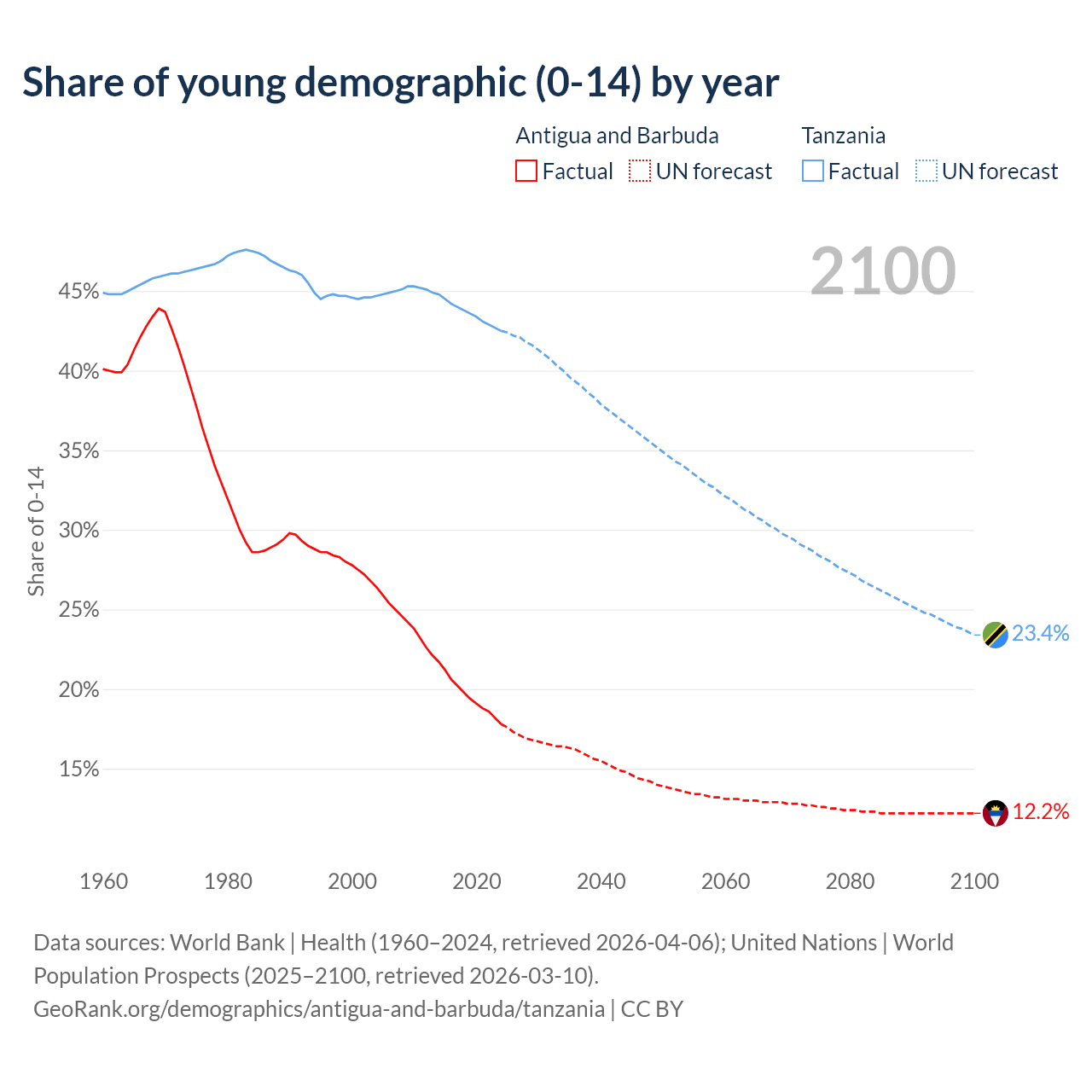 - The share of young demographic (0-15 years old) in Antigua and Barbuda is 17.8% vs 42.5% in Tanzania.